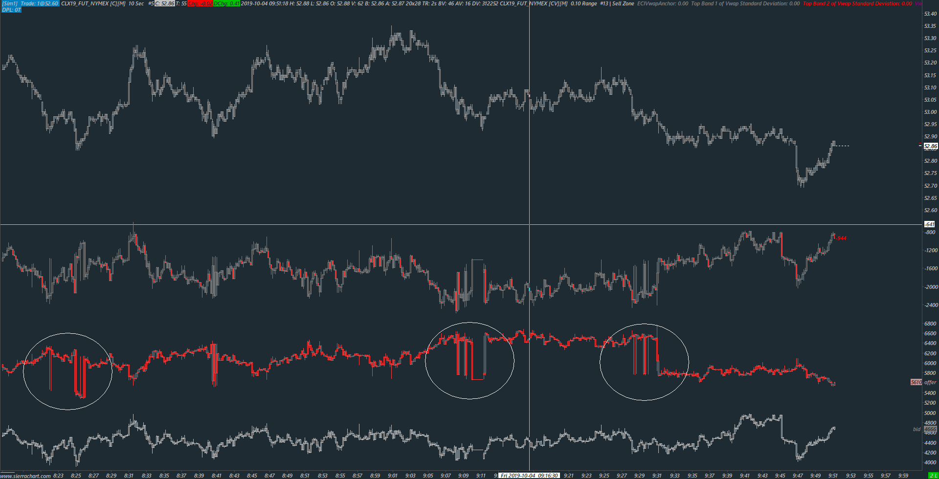 This is answered here: Huge spikes on Denali offer data Now we are wasting our time answering questions about activity of the market. Look at the Market Depth window and see what is happening. You can blame the trader who put that 800 lot order in. Sierra Chart Support - Engineering Level Your definitive source for support. Other responses are from users. Try to keep your questions brief and to the point. Be aware of support policy: https://www.sierrachart.com/index.php?l=PostingInformation.php#GeneralInformation For the most reliable, advanced, and zero cost futures order routing, *change* to the Teton service: Sierra Chart Teton Futures Order Routing Date Time Of Last Edit: 2019-10-04 15:45:10