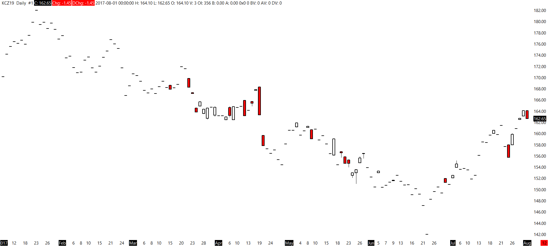 So, I opened the KCZ19 Chart (Intraday) with daily bars (Candlesticks). But the period from Jan.2017 until March.2018 is not shown correctly as there are no real bars (check the graphik). Please tell me, what I did wrong and how I can see the whole candlesticks. Thank You. http://www.sierrachart.com/image.php?Image=1570274790516.png |