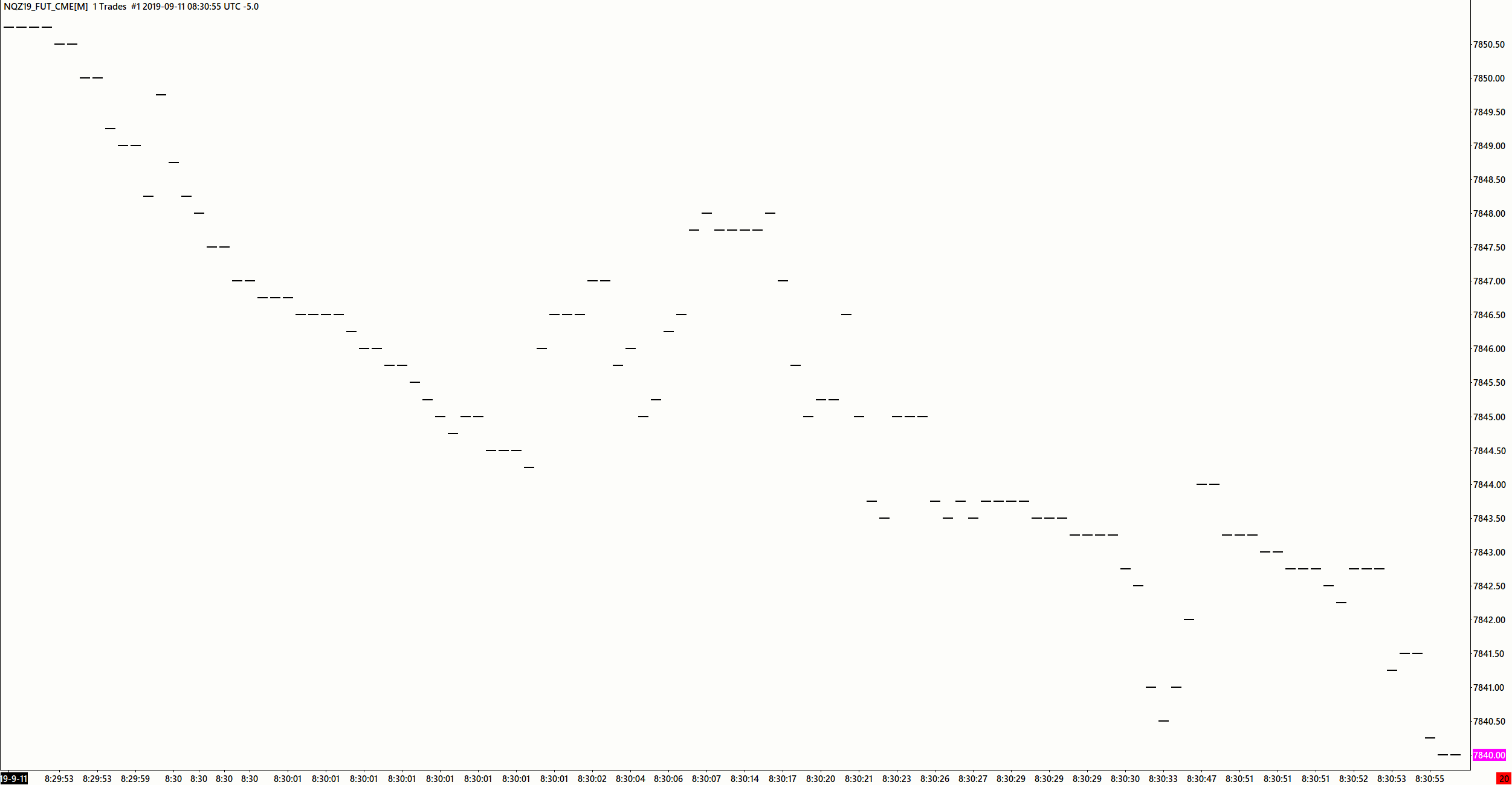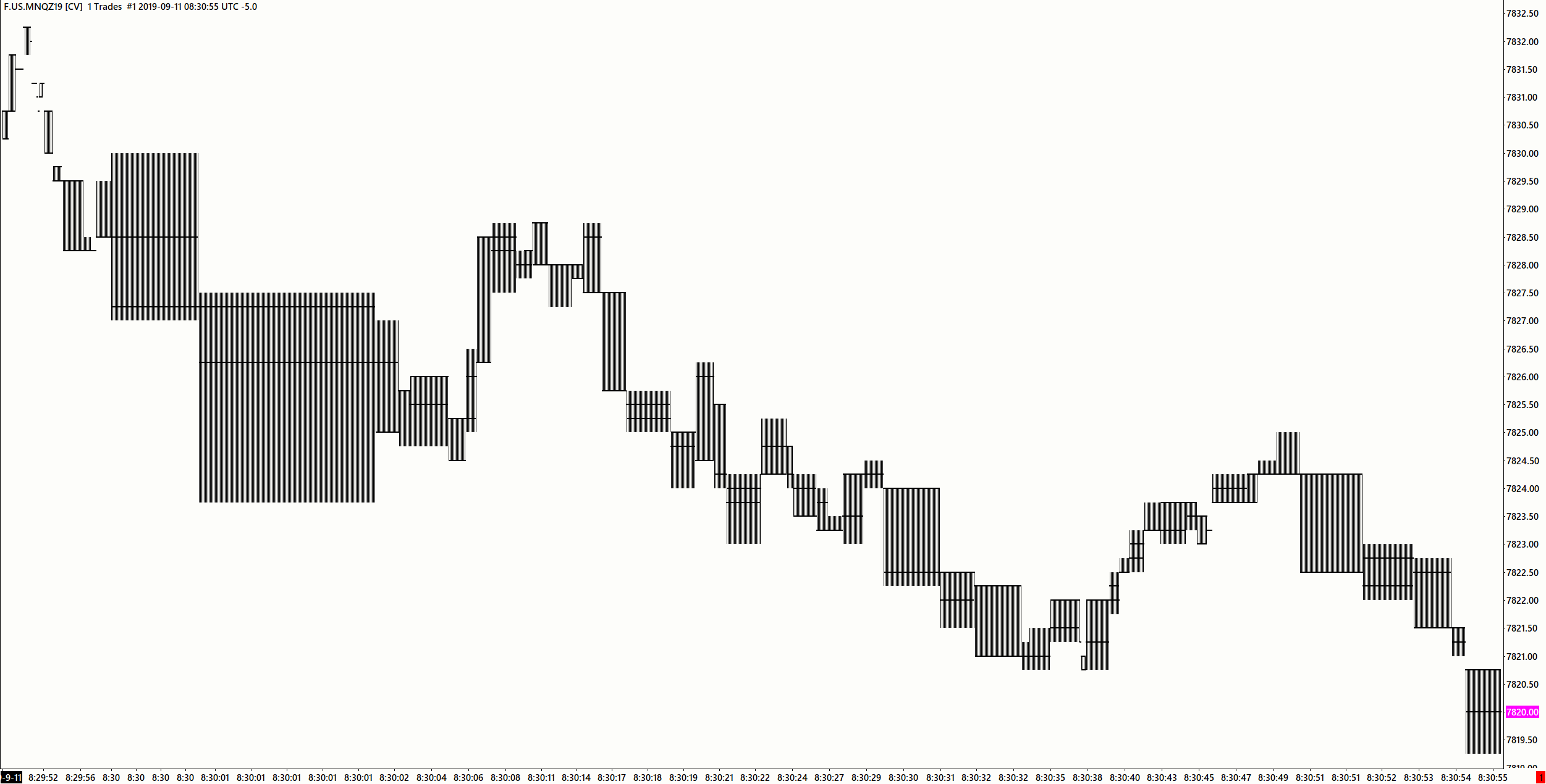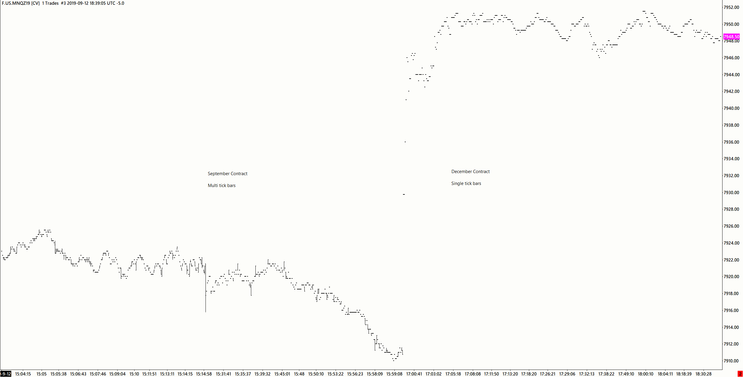 Hi Support, Thanks for your reply. I unticked the Split Data Records option and it did reload as single bars so part of the problem fixed. The Denali Data feed is a lovely chart of 1 tick only per bar. The CQG data feed still shows most bars bigger than 1 tick up to the start of the current contract. All the bars forward in the December contract are 1 tick only. Chart Image http://www.sierrachart.com/image.php?Image=1570431585511.png Is there some way to achieve 1 tick bars prior to the current contract with the CQG data feed? Thanks again for your help. Peter |