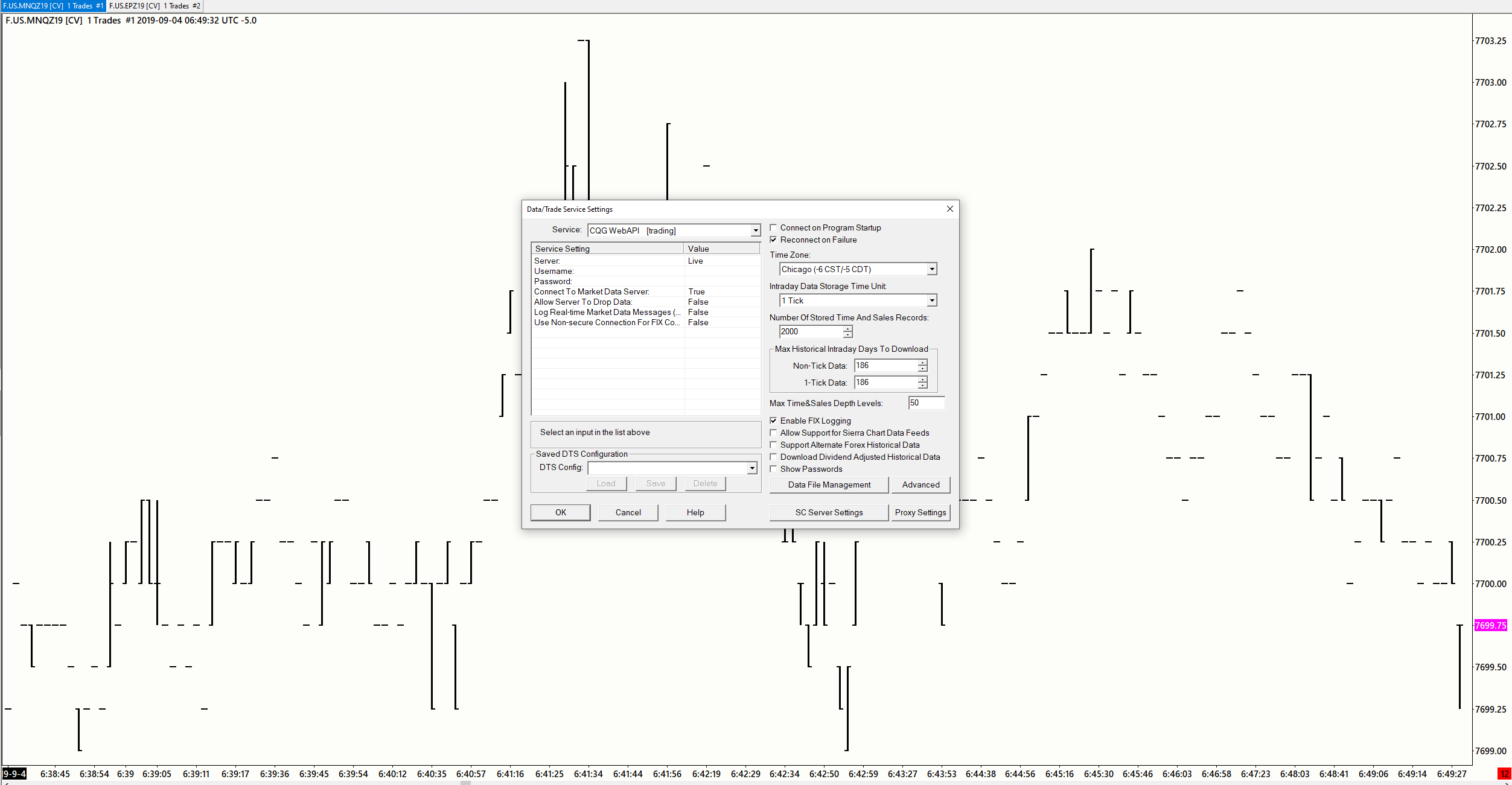The CQG data feed still shows most bars bigger than 1 tick up to the start of the current contract. You need to change your Sierra Chart service package to the Advanced package for tick by tick data for expired contracts:To change your Sierra Chart Service Package, select "Help >> Account Control Panel" on the Sierra Chart program menu. On the displayed webpage, click on the "Set Service Package for Renewal" link. Or go to this page: https://www.sierrachart.com/UserControlPanel.php?page=ServicesActivation You will need to login if you are not currently logged in. In the "Available Services >> Choose Usage Time Service Package" frame, select the Service Package that you want to set your account to. Press the "Set" button. The remaining service usage time on your account will be adjusted based upon the cost of the package you are changing to. If the new package is a higher-priced package, then the usage time will be reduced due to the higher price. There is no charge for changing your Sierra Chart service package. Only your Sierra Chart account usage time ending date is adjusted. Sierra Chart Support - Engineering Level Your definitive source for support. Other responses are from users. Try to keep your questions brief and to the point. Be aware of support policy: https://www.sierrachart.com/index.php?l=PostingInformation.php#GeneralInformation For the most reliable, advanced, and zero cost futures order routing, *change* to the Teton service: Sierra Chart Teton Futures Order Routing Date Time Of Last Edit: 2019-10-08 02:29:24