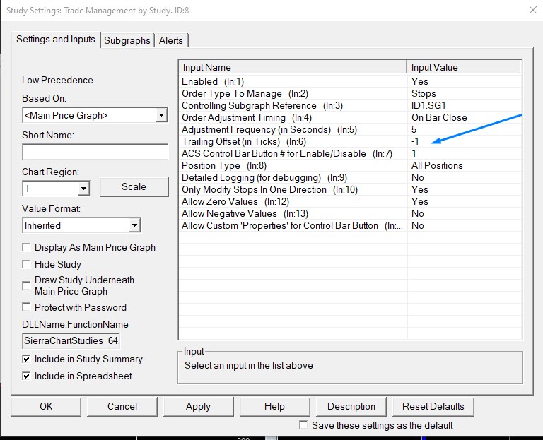 Can you please confirm if this is the correct setting in using the Trailing Offset input parameter? My controlling study subgraph (ID1.SG1 - this is the 10 Exponential Moving Average). If I want to enable a trailing stop one tick below ID1.SG1, can I use "-1" in the Trailing Offset field? See attached screenshot. However, how would I configure it so that the trailing stop is triggered if the price is 1 tick above ID1.SG1 for a short position and -1 tick below (-1) below ID1.SG1 if it is a long position? |