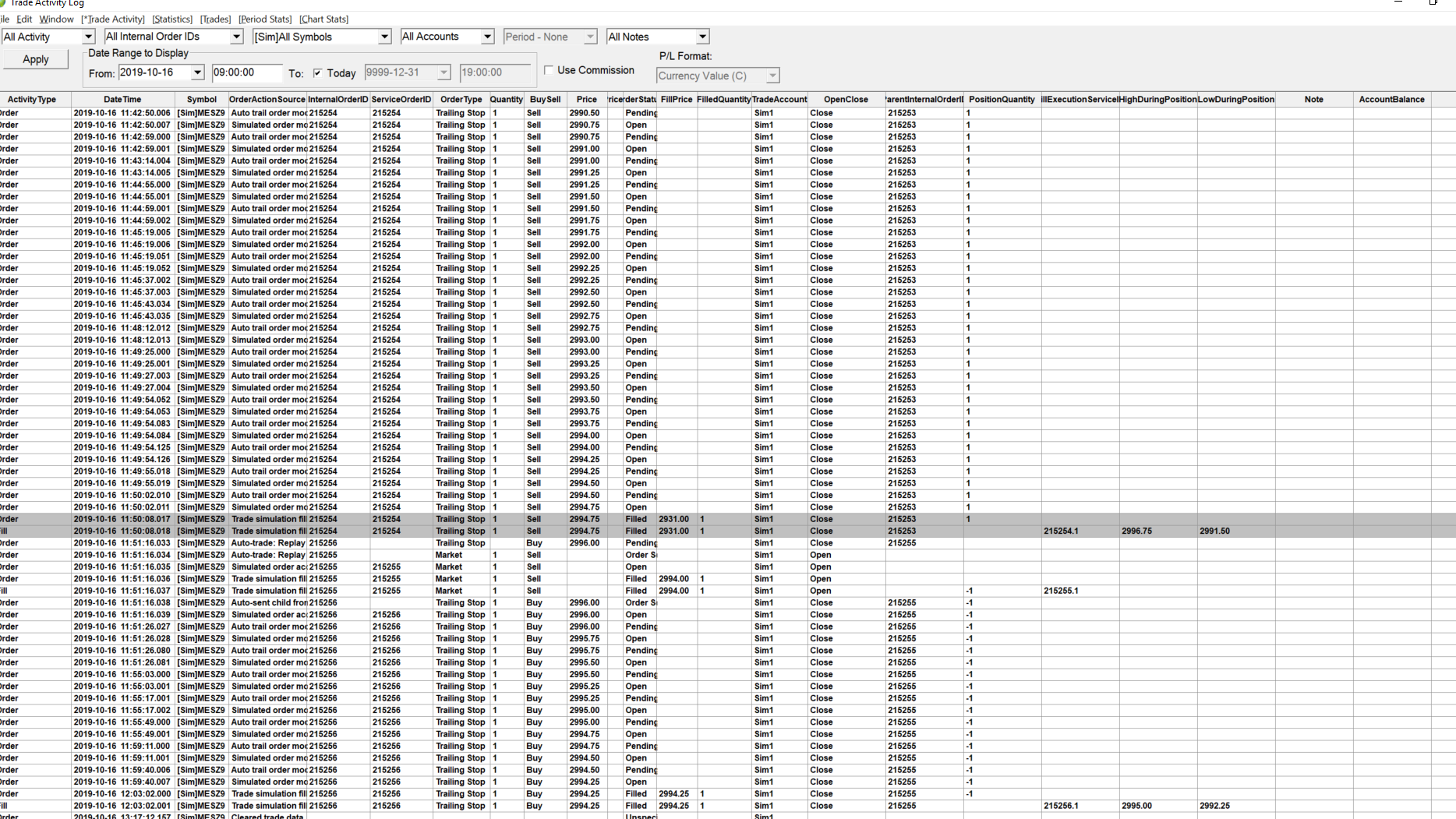 ActivityType DateTime Symbol OrderActionSource InternalOrderID ServiceOrderID OrderType Quantity BuySell Price Price2 OrderStatus FillPrice FilledQuantity TradeAccount OpenClose ParentInternalOrderID PositionQuantity FillExecutionServiceID HighDuringPosition LowDuringPosition Note AccountBalance Order 2019-10-01 10:00:50.114 [Sim]ESZ9 Trade simulation fill. Bid: 2984.25 Ask: 3048.50 Last: 2985.00 215369 215369 Trailing Stop 1 Buy 2985.00 Filled 3048.50 1 Sim1 Close 215368 -1 Fill 2019-10-01 10:00:50.115 [Sim]ESZ9 Trade simulation fill. Bid: 2984.25 Ask: 3048.50 Last: 2985.00 215369 215369 Trailing Stop 1 Buy 2985.00 Filled 3048.50 1 Sim1 Close 215368 215369.1 2985.00 2983.00 |