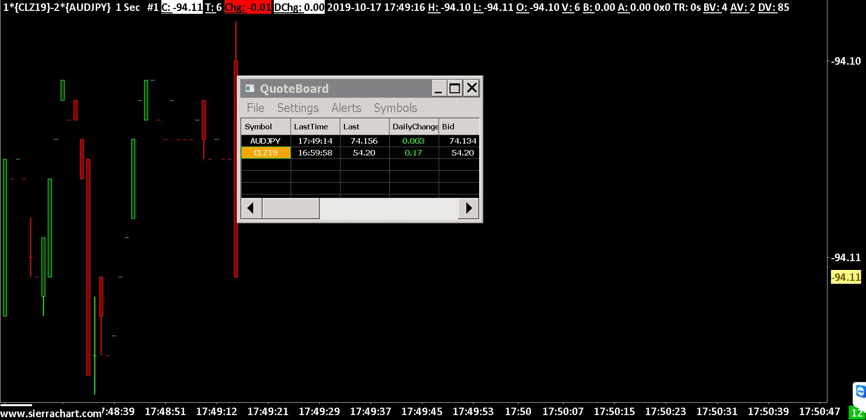 UPDATE: I have managed to work this out. There is still a problem. For example, I have created a custom symbol with following code 1*{CLZ19}-2*{AUDJPY}. This is showing value on chart currently of circa -387. CL is currently trading at 53.32 and AUDJPY at 73.534. Therefore, how do I get the custom symbol to show as trading at (1*53.32)-(2*73.534) = -93.748 on the chart. I just want to see the price differential between the two assets, given the multipliers I have stated. Also, it does not seem to be showing any historical data, just the current bar? Any fix for this? Thanks in advance |