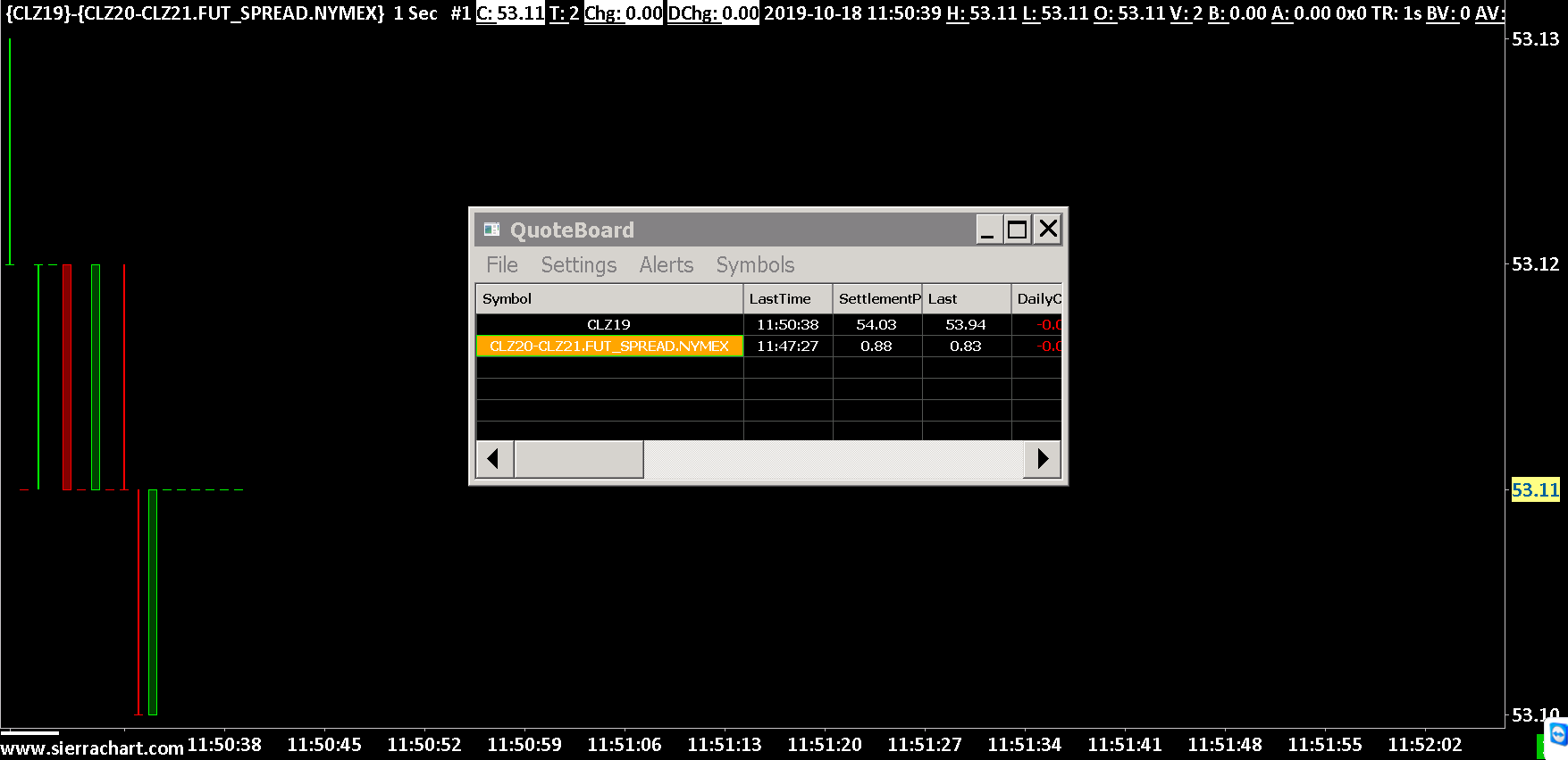 This will be resolved in the next release (out in a few days). It is because these spreads are transmitted in an unadjusted price format as the data comes from the exchange. So we needed to apply a price multiplier . This is now done: http://www.sierrachart.com/image.php?Image=1571413839179.png Sierra Chart Support - Engineering Level Your definitive source for support. Other responses are from users. Try to keep your questions brief and to the point. Be aware of support policy: https://www.sierrachart.com/index.php?l=PostingInformation.php#GeneralInformation For the most reliable, advanced, and zero cost futures order routing, *change* to the Teton service: Sierra Chart Teton Futures Order Routing |