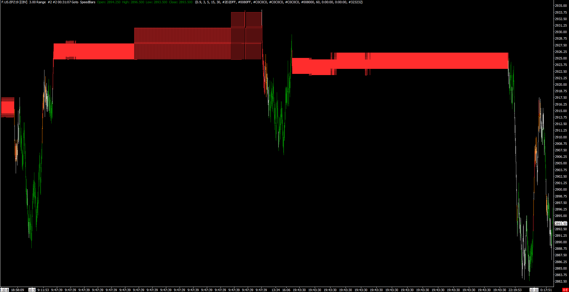 Anybody using other data source than CQG and have these bursts (2) on the chart ? Date 2019-10-09 Time 9:47 and 19:43 (UTC+0) Symbol E-Mini S&P 500 futures december 2019 contract Here is my 12 tick Range bar chart and this is CQG data source: http://www.sierrachart.com/image.php?Image=1571298707892.png I've seen this kind of bursts a lot lately making range bar charts very difficult to follow... Date Time Of Last Edit: 2019-10-17 07:57:14