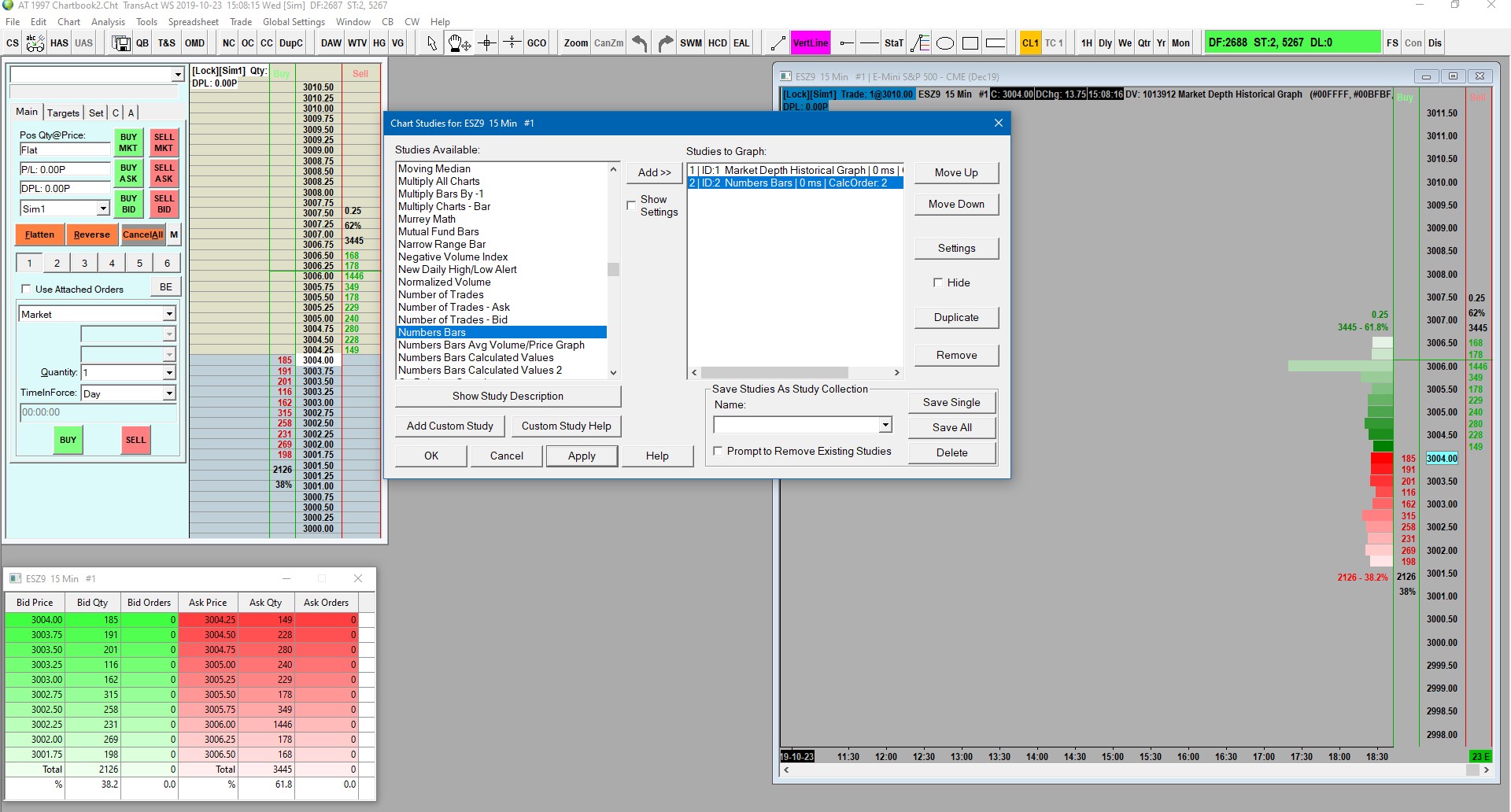 I have an issue with Market Depth not displaying on Charts. It does show on the Sierra DOM and Market Depth window, just not on the charts. I also have an issue with the Number Bars not displaying. It was all working until 2 days ago. I have tried installing an older version after which it prompted me to reinstall the latest version with no change. Sierra Version 1997 Broker is Transact Date Time Of Last Edit: 2019-10-23 20:25:04