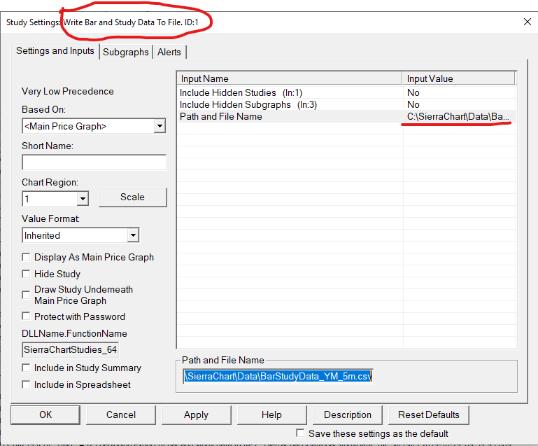 We are unable to reproduce this: Every time I point the Path and File name to C:\Datafiles\BarStudyData_YM_5m.csv I see that in the Log file Sierra had reset the location to the folder C:\SierraChart\Data\BarStudyData_YM_5m.csv Sierra Chart Support - Engineering Level Your definitive source for support. Other responses are from users. Try to keep your questions brief and to the point. Be aware of support policy: https://www.sierrachart.com/index.php?l=PostingInformation.php#GeneralInformation For the most reliable, advanced, and zero cost futures order routing, *change* to the Teton service: Sierra Chart Teton Futures Order Routing Date Time Of Last Edit: 2019-11-29 16:40:40