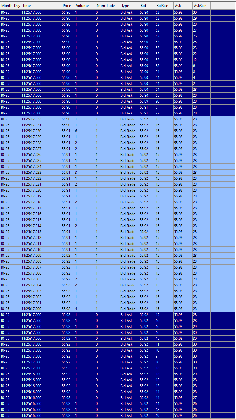 1. Is it possible to use Market Depth Historical Graph study on chart with BID_ASK_TRADE_SYNC Data Recording Modes? (I add this study to chart but no any data appears) 2. Is it possible to use Market Depth Historical Graph study on chart with NumberOfTradesPerBar = 1? (When I do it, there are many missed data. Screenshot attached.) 3. Time & Sales windows's screenshot attached. There are 33 trades (total volume 50) which not interrupted by BidAsk Records! these trades are executed at three prices: 55.92 (vol 15), 55.91 (vol 33), 55.90 (vol 2). I can see Bid Aks Record right before this trades with best bid price and bid size! How can I get access to 10 levels of Market Depth through ACSIL(not only best bid ask) right before this trades? I need to know 10 levels of Market depth before this trades to detect Iceberg Orders. In this example bid ask records before trades show me bid price = 55.92 and bid size = 15. Total volume of executed trades at 55.92 equal 15, it means that no any iceberg orders at 55.92. But I can't make the same calculations at 55.91 and 55.90 because i dont know bid size at that prices right before trades execution. 4. I have studied ACSIL Interface Members - Historical Market Depth Data (c_ACSILDepthBars) and found there - "It is also supported to access the most recent market depth data through the sc.SymbolData ACSIL member. This is an alternative to access the current market depth data. You will also need to access the current market depth data through this ACSIL member whenever market depth data changes after a chart bar has completed but before there is a new trade for the next bar which has not yet been displayed because there has not yet been a trade for that new upcoming bar." But can't find detailed information how to use it in practice. Help me with this please. Thanks in advance PS I dont need any programm help! Just info and some idea! |