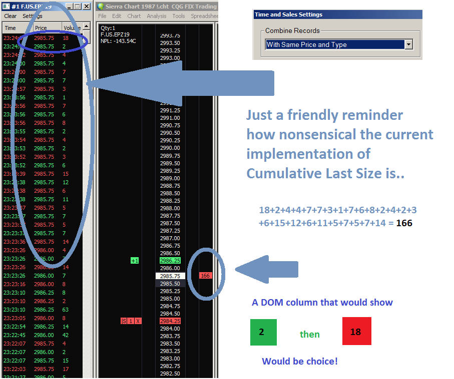 Actually it DOES matter if trade is at the bid or ask. There is a serious need for a new setting to RESET cumulative last size if price doesn't move level but changes from bid to ask and vice versa. It makes more sense than not to reset it. Also this is how it works on some other major trading plateform so it's confusing that it is not possible to have it work in such way on SC. Example: When 300 contracts traded at bid, then 1 at ask but at same level, number is not reset but has bg color of ask and accumulated number is 301 at ask level where in reality only 1 contract hit ask... This is simply an erroneous information and if we missed the action within a blink of an eye we could be mislead. I know we have the recent bid/ask volume columns, but some of us try to reduce number of columns while still glanning maximum information possible. Date Time Of Last Edit: 2019-10-30 23:37:20
