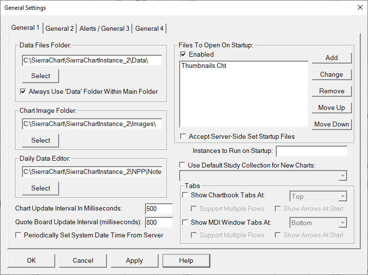 Hello, I started a second instance through the File >> New Instance method. Indeed it just auto starts it now. I have things mostly set up and it appears to be pulling real-time intraday stock data from the primary instance just fine. What does not seem to be working correctly is the symbol entry from the chart window. If I type in "IBM" for example it defaults to some other symbol that I already had loaded through the "Find" method. How can I get it to NOT do this and instead go to the primary instance and download data? Alternatively, I am OK with the sub-instance using the primary's data folder if that is possible. Currently, the Data Files Folder is set to the sub-instance's folder AND the "Always Use Data Folder Within Main Folder" is CHECKED. Yet it populates the instance's data folder with symbol data, which isn't a huge problem but seems unnecessary for my purpose. The purpose for this second instance, if that helps, is to display thumbnail charts for 12-14 stocks (which will change daily) of a 2-minute chart. I don't need historical data, just the current intra-day data. Edit to add screenshot of sub-instance settings. Date Time Of Last Edit: 2019-11-04 16:40:10