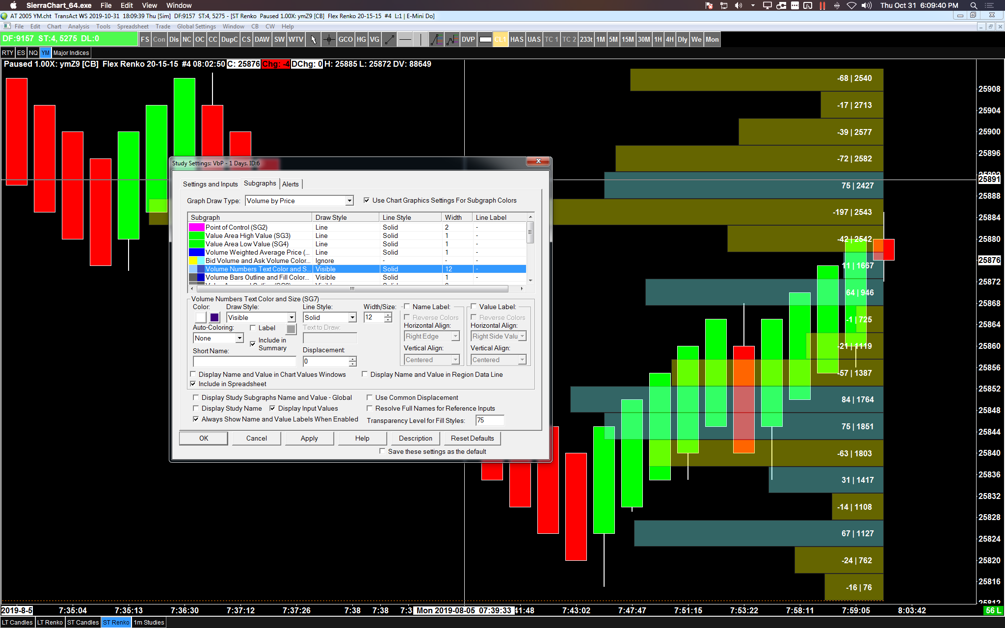 The first thing is to make sure that you are using the correct Subgraph for the particular values that you are wanting to change. From your wording, we assume you are trying to change the color of the text that is drawn inside of a bar that is defined by the Input for Display Volume in Bars. For this text, you need to adjust the colors in the Subgraph named Volume Numbers Text Color and Size. When this Subgraph is selected, there will be 2 boxes under the Color heading, by default the one on the left is White and the one on the right is a Dark Blue. The Primary color is the one on the left and is used for Positive Values, the Secondary color is the one on the right and is used for Negative values. Be sure that after you select the color and change it, that you also select Apply or OK on the Settings page to have the change update the Volume by Price profile. If you select Cancel, the color change will not be kept. If you are using all of this correctly and still having problems, please attach a screenshot of your chart showing the wrong coloring for the numbers. The information for how to attach a screenshot can be found here: Support Board Posting Information: Attaching or Posting a Screenshot/Image (Optional) For the most reliable, advanced, and zero cost futures order routing, use the Teton service: Sierra Chart Teton Futures Order Routing |