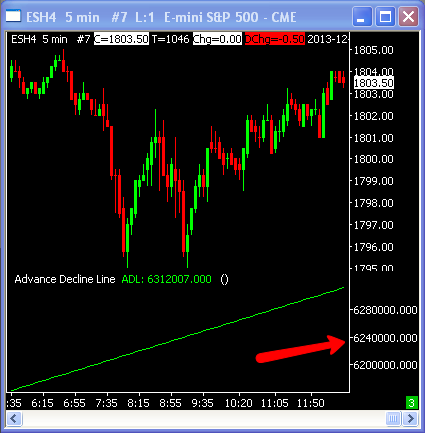 It does not make sense to apply the Advance Decline Line study to a ES chart. It should be applied to the $NSHF symbol. To adjust the number of decimal places for a study, refer to this help topic: http://www.sierrachart.com/index.php?l=doc/helpdetails32.html#StudyOnTheChart Sierra Chart Support - Engineering Level Your definitive source for support. Other responses are from users. Try to keep your questions brief and to the point. Be aware of support policy: https://www.sierrachart.com/index.php?l=PostingInformation.php#GeneralInformation For the most reliable, advanced, and zero cost futures order routing, *change* to the Teton service: Sierra Chart Teton Futures Order Routing |