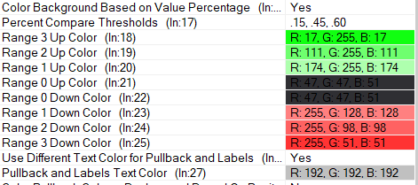 With respect to post #11: The only difference between how it worked previously and the latest update is that if the current developing bar goes above the highest value or below the lowest value that has been established by a bar previously, then all of the colors will not update to that new high or low but will stay the same color. The developing bar will then be colored the Range 3 Up/Down color. This is all explained in fifth paragraph the documentation here: Numbers Bars: Calculated Values Background Coloring Logic For the most reliable, advanced, and zero cost futures order routing, use the Teton service: Sierra Chart Teton Futures Order Routing |
