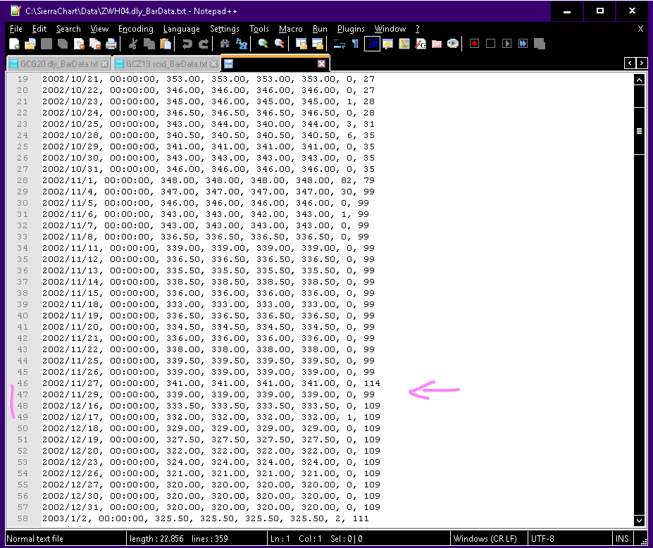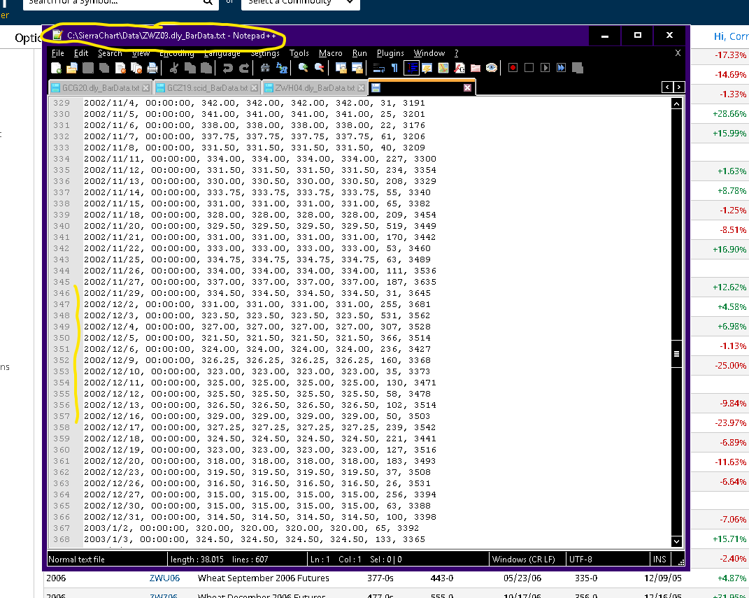 hi, I have downloaded ZWH04 (March Wheat contract from 2004) and I noticed something strange: from 2002-11-29 it jumps straight to 2002-12-16 first Picture (P1), even though the other contracts have been trading during those days, as shown in the second picture (P2). Also in P3, it is shown in the forward curve from 2002-12-02 that it indeed has been trading. I already asked Barchart.com about this, because you both have the exact same issue, they said it is due to holidays, which does not make sense to me because those contracts (P1 and P2) are on the same exchange, so either both did not trade on that date or both did. Am I missing something? I would be very pleased if you could help me. If you need more information, please let me know. Sincerely David Date Time Of Last Edit: 2019-11-05 21:02:44