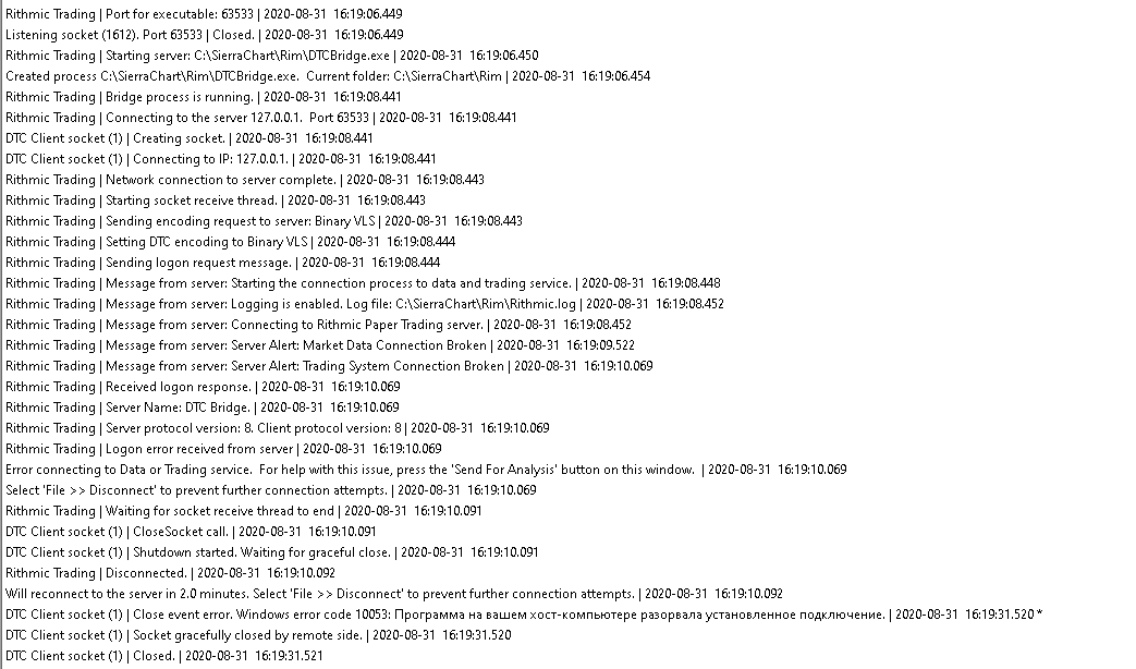 Regarding post #8 you need to install the latest Rithmic bridge files: Rithmic Bridge Files Sierra Chart Support - Engineering Level Your definitive source for support. Other responses are from users. Try to keep your questions brief and to the point. Be aware of support policy: https://www.sierrachart.com/index.php?l=PostingInformation.php#GeneralInformation For the most reliable, advanced, and zero cost futures order routing, *change* to the Teton service: Sierra Chart Teton Futures Order Routing |