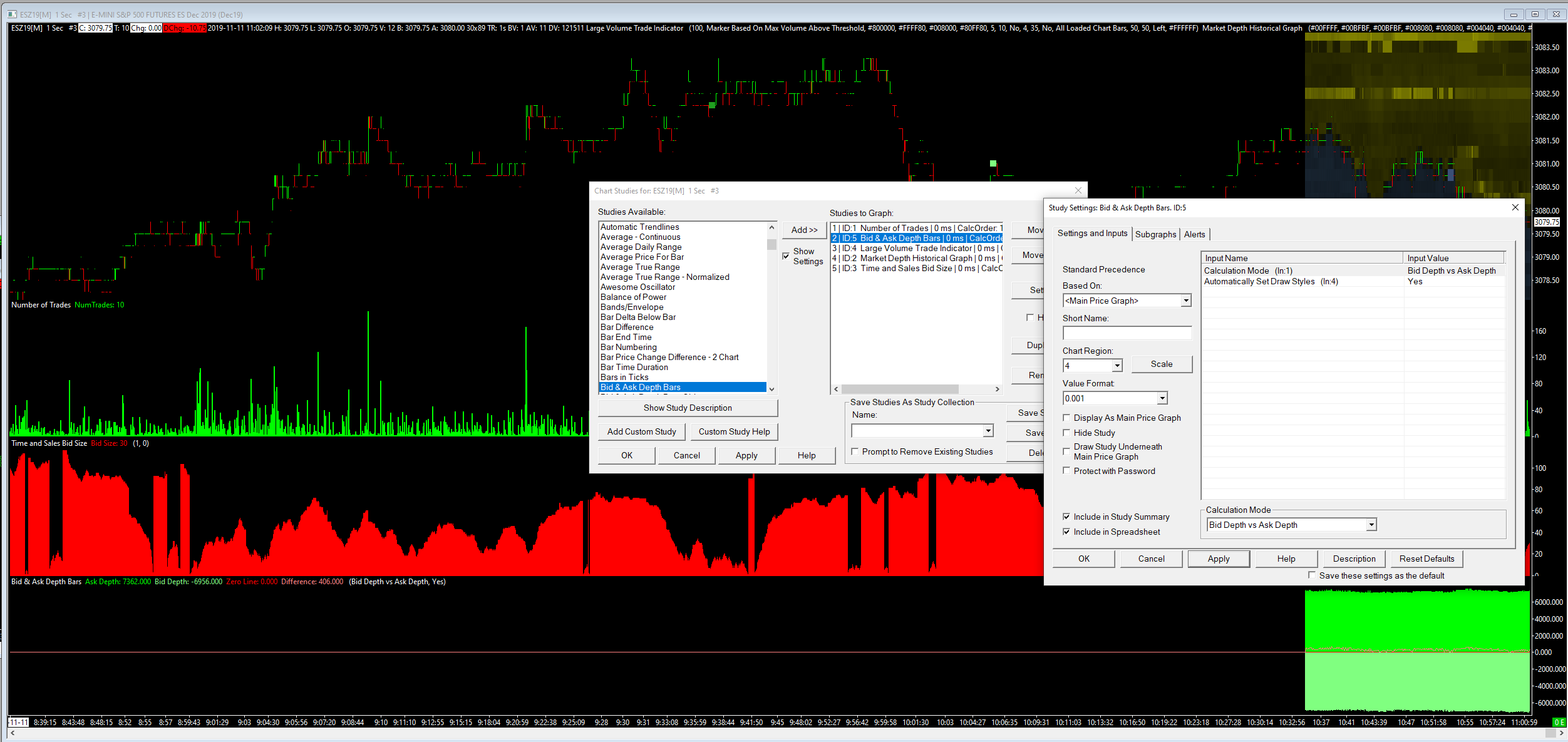 1. Have a look at this study: Bid & Ask Depth Bars 2. This is not within the scope of our support. The result must be accurate based on the settings. Sierra Chart Support - Engineering Level Your definitive source for support. Other responses are from users. Try to keep your questions brief and to the point. Be aware of support policy: https://www.sierrachart.com/index.php?l=PostingInformation.php#GeneralInformation For the most reliable, advanced, and zero cost futures order routing, *change* to the Teton service: Sierra Chart Teton Futures Order Routing |