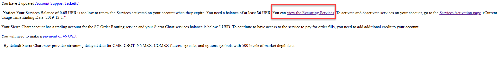I have two questions to ask: 1. Explain to me how to turn off Recurring Services (image in attachment) 2. I want to try sierrachart realtime datafeed and IB for execution only. I can try 2 Week Trial for 5 USD Step to try • I make 2 Week Trial for 5 USD payment • In Sierra Data / Trade service setting (image in attachment) ---- A. Date Time Of Last Edit: 2019-12-02 13:53:09