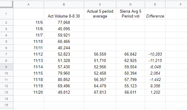 I have noticed an issue with the average volume part of the relative volume study that seems to lead to inaccurate relative volume output. The chart (link below) has the volume numbers based on the Numbers bars calculated values study for each half hour period and an overlay of the average volume calculated by the relative volume study. I have attached an image of my calculations for a 5 period average compared to the relative volume's calculation for a 5 period average and the difference (all for the 8-8:30 time frame, which is highlighted in the chart). Additionally I attached an image of my relative volume settings. Please let me know if I am making a mistake somewhere or there is an issue with the study's calculations. Thank you. http://www.sierrachart.com/image.php?Image=1574276667518.png |