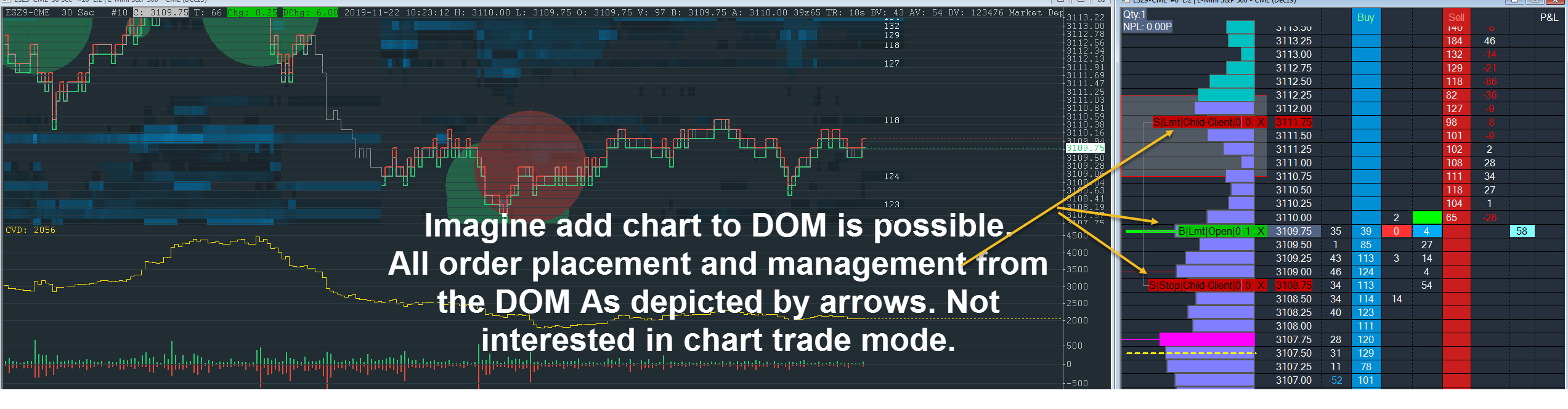 Hello, Currently, we are able to add a DOM to a chart, but not the opposite. Though this might seem to be exactly the same thing. It is not. For those of us who have spent time customizing & tweaking our DOM settings/columns etc, we have to start again. For those of us who like to primarily focus on the DOM for scalping, it is also a distraction having to keep shifting eyes & cursor to the chart to move the targets & Stops as we like our eyes on the current trades at all times once in the trade so to manage it Though for my method it is important to have the chart & DOM price ladder synced and at the same visual level. Is this something you can do? I hope I have explained this clearly. I have attached an image to hopefully help you understand my request. Many thanks |