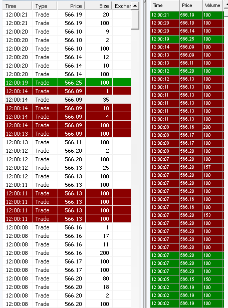 I use: a) IQFeed + SC (prints < 100 share are not visible in TuS) b) IQFeed + other Tool (prints < 100 shares are visible in TuS + all shown by SC TuS ) Since I have no filters set, I assume this is an internal issue of SC. The other issue regarding the prints filled between Bid and Ask has nothing to do with the data feed, since the charting tools handle this. In the second tool I use it is possible to color code every possible state a print might have. Happy christmas and a profitable new year ! |