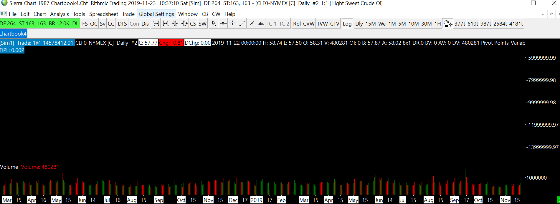 Refer to this section: Chart Scale and Scale Adjusting: Chart Bars or Studies Not Completely within View, Not Displayed, or Cut Off. Reset Scales. Sierra Chart Support - Engineering Level Your definitive source for support. Other responses are from users. Try to keep your questions brief and to the point. Be aware of support policy: https://www.sierrachart.com/index.php?l=PostingInformation.php#GeneralInformation For the most reliable, advanced, and zero cost futures order routing, *change* to the Teton service: Sierra Chart Teton Futures Order Routing Date Time Of Last Edit: 2019-11-23 14:28:28