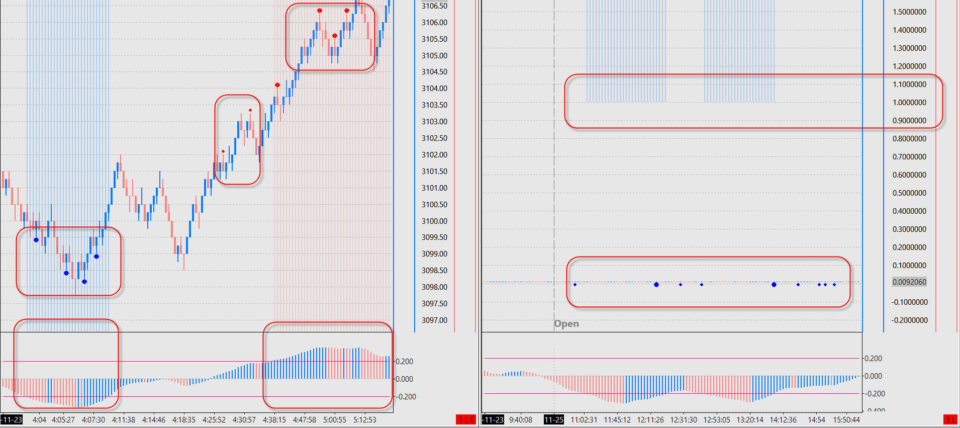 Good day support. Indicators and a table have been added to the e-mini SnP 500 chart. The table contains the trading system. The system opens trades (candles with large points), marks potential areas for entry (vertical lines of blue and red), marks candles with the lowest probability for entry. There are no questions to the first chart. I try to add the second chart (duplication) in the same table on the second sheet with the same algorithm of work. The second chart shows Japanese Yen (the chart is compressed to show vertical lines). Signals (big and small dots) are visible on the chart but vertical lines of blue and red are not visible. Rather, they are displayed but above the price values of 1.0000000. Japanese Yen has no such prices. Question: why is this happening? why are vertical lines not displayed in the price area (on bars)? The version of the terminal 2015. Date Time Of Last Edit: 2019-11-25 08:46:25