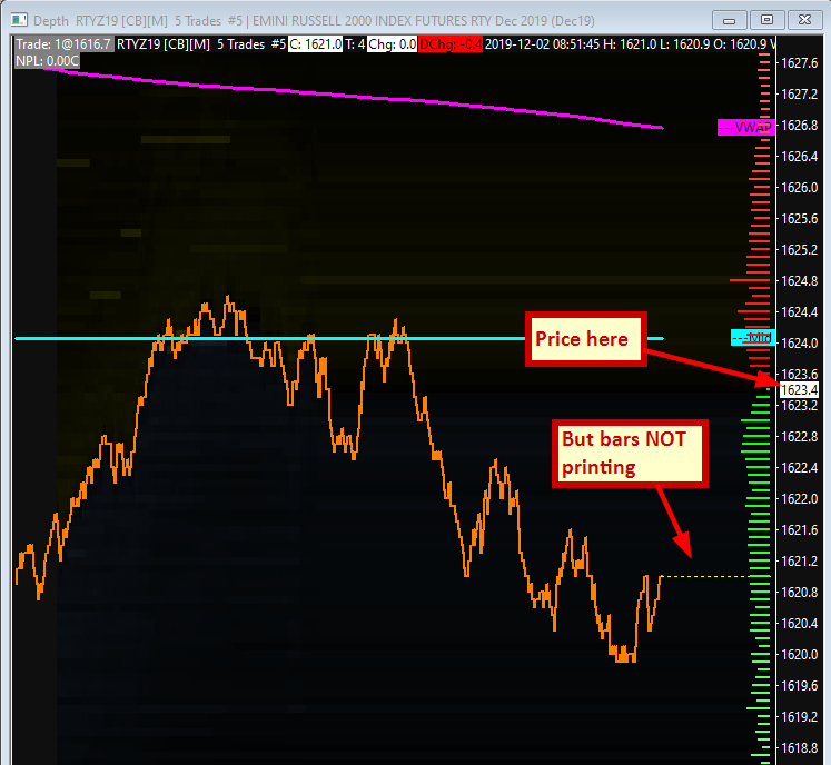 Could you please look into my account and let me know if the problem I'm experiencing is technical or related to my account? I'm attaching an image to show the problem.... as it can be seen, the bars are not printing/updating as price continues to change. FYI, I have installed the latest version of Sierra AND I'm also on "live" trading. Thanks for your prompt response. |