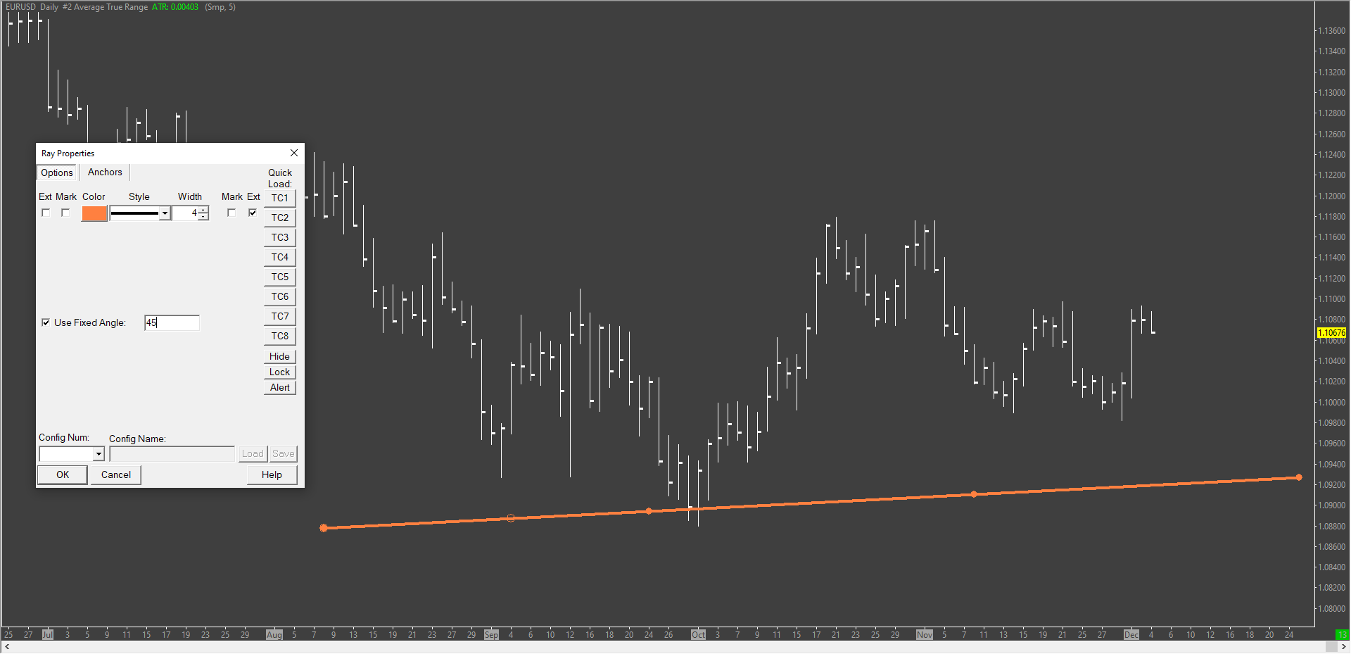 Yes this is the relevant documentation to refer to: Chart Drawing Tools: Drawing a Line with a Specific Angle or Slope Sierra Chart Support - Engineering Level Your definitive source for support. Other responses are from users. Try to keep your questions brief and to the point. Be aware of support policy: https://www.sierrachart.com/index.php?l=PostingInformation.php#GeneralInformation For the most reliable, advanced, and zero cost futures order routing, *change* to the Teton service: Sierra Chart Teton Futures Order Routing |