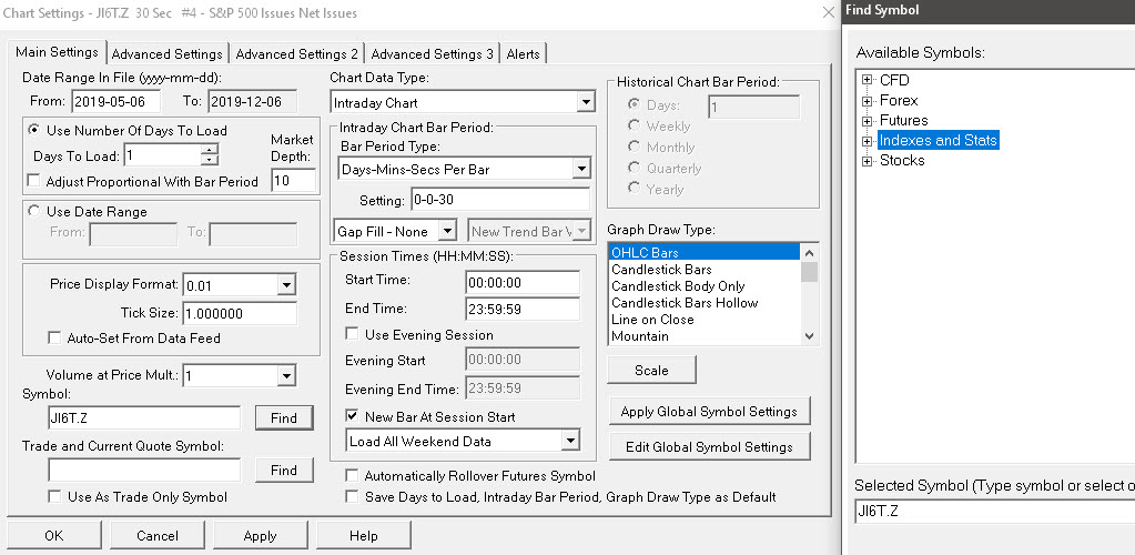 Where do I get things like tick, AD Line / net issues? These are part of the Sierra Chart market statistics. Here is the documentation which you have already seen:Sierra Chart Market Statistics You do not need to run two separate instances of Sierra Chart. The market statistics are accessible with all of the supported Data and Trading services. You will find the symbols in File >> Find Symbol >> Market Stats. Let us know if you need more help. Regarding real-time data from exchanges, what exchanges did you need data for? We can help you get set up with the data feed. Sierra Chart Support - Engineering Level Your definitive source for support. Other responses are from users. Try to keep your questions brief and to the point. Be aware of support policy: https://www.sierrachart.com/index.php?l=PostingInformation.php#GeneralInformation For the most reliable, advanced, and zero cost futures order routing, use the Teton service: Sierra Chart Teton Futures Order Routing Date Time Of Last Edit: 2019-12-06 16:34:37