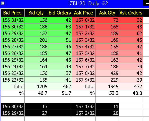 In response to post #3, we understand what you are saying. Could you please post your comments here about this: bids offers closes to price on market depth historical graph It is hard for us to make this an option. Either we just have to take it out which is no problem or we just have to leave it. However, can you tell us what symbol you are referring to and at what time and time zone. This is what we currently see for ZBH20 (refer to attachment). The top is the standard order book and the bottom is the implied depth. The implied depth adds very little at this time. Below 20%. And certainly not 500%. Update: We see that you are mentioning ultra bonds (UB). Yes we do see what you mean in that case. Our example is with ZB which is different. However, we are not seeing up 500% difference. More like 200% at one level. Sierra Chart Support - Engineering Level Your definitive source for support. Other responses are from users. Try to keep your questions brief and to the point. Be aware of support policy: https://www.sierrachart.com/index.php?l=PostingInformation.php#GeneralInformation For the most reliable, advanced, and zero cost futures order routing, use the Teton service: Sierra Chart Teton Futures Order Routing Date Time Of Last Edit: 2019-12-18 04:17:36