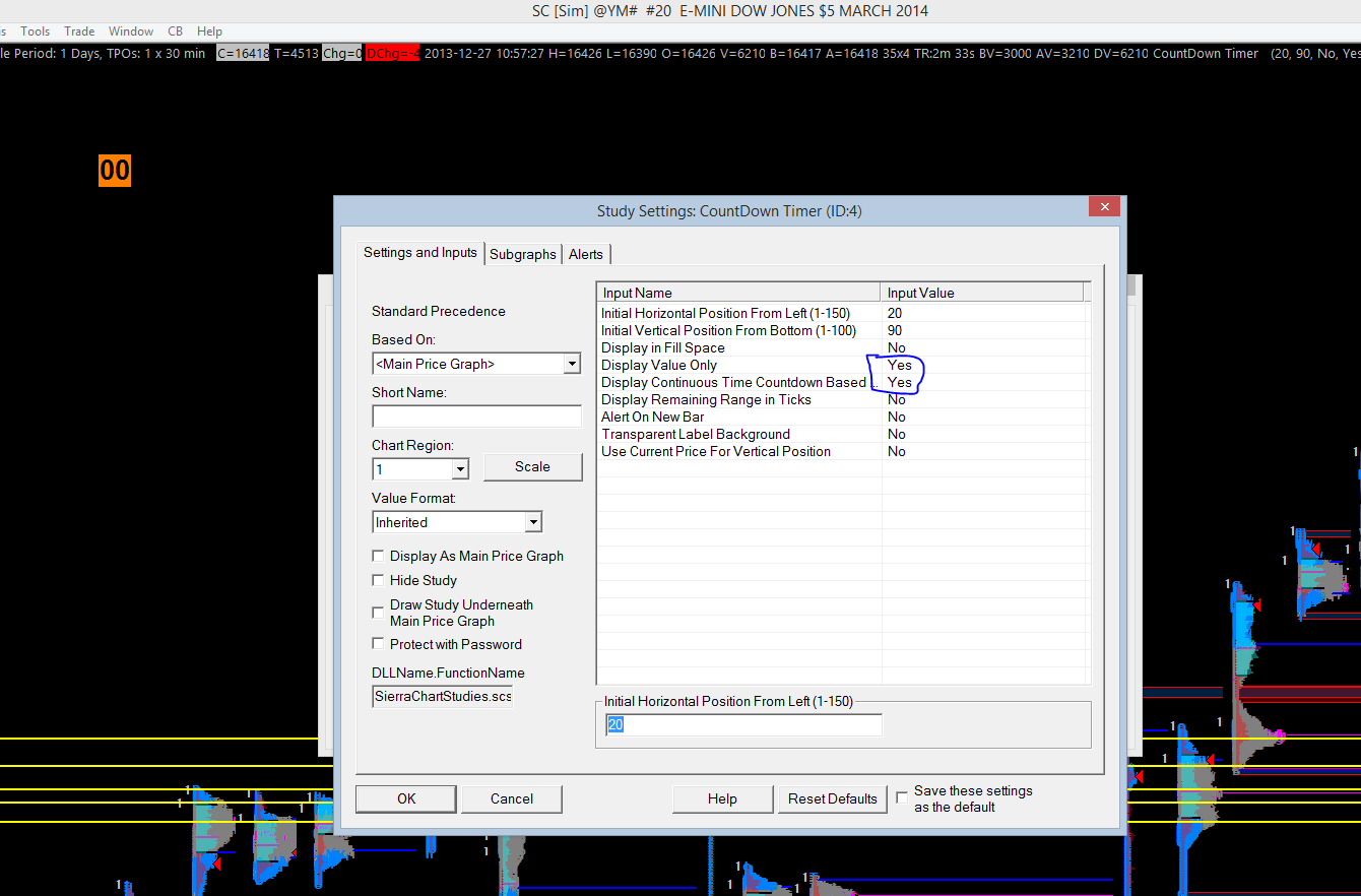 Hello i would like to add the countdown timer studie on my TPO chart but when i want to select " Display Continuous Time Countdown Based On Real Time Clock" on yes, there is only 00 (see pictures) There is any way to do it please ? |