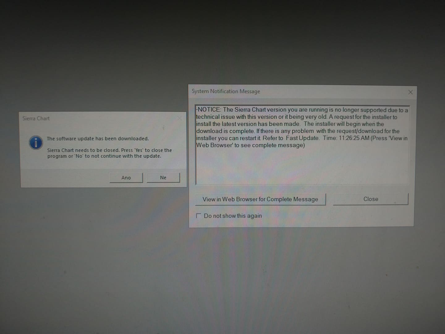 Sierra ask me on start - the software update has been downloaded, but when I click yes - sierra will close and nothing happend - image in Attachment When I try to download current version from menu in siera this is the log: Reading Internal Order ID file. | 2019-12-10 11:28:39 Reading Trade Orders file. | 2019-12-10 11:28:39 Reading Trade Positions file. | 2019-12-10 11:28:39 Account Balance file. | 2019-12-10 11:28:39 UDPListener (1160). Port 22904 | Listening on UDP port 22904. | 2019-12-10 11:28:39 Software version: 1875 64-bit | 2019-12-10 11:28:39 Usage time has ended. Sierra Chart is in Free mode. Features are restricted. | 2019-12-10 11:28:39 To purchase usage time, select 'Help >> Add Usage Credit' on the menu. | 2019-12-10 11:28:39 * Allow Support for Sierra Chart Data Feeds is enabled. | 2019-12-10 11:28:39 Current selected Data/Trading service: CQG WebAPI | 2019-12-10 11:28:39 Chart Update Interval: 500 | 2019-12-10 11:28:39 Intraday Data Storage Time Unit: 0 | 2019-12-10 11:28:39 Time Zone: +00:00:00 (UTC+00) | 2019-12-10 11:28:39 2019-12-10 12:28:38 Local computer time | 2019-12-10 11:28:39 2019-12-10 11:28:38 Local computer time in UTC | 2019-12-10 11:28:39 2019-12-10 11:28:38 Local computer time in SC Time Zone | 2019-12-10 11:28:39 2019-12-10 11:28:39 Server time in UTC | 2019-12-10 11:28:39 Local computer UTC time and Server UTC time difference: 1 seconds. | 2019-12-10 11:28:39 Program path: C:\SierraChart\ | 2019-12-10 11:28:39 Data Files path: C:\SierraChart\Data\ | 2019-12-10 11:28:39 OS Version Number: 10.0 | 2019-12-10 11:28:39 Locale Setting: C | 2019-12-10 11:28:39 DLLs: Trade29CustomStudies.dll, Trade29CustomStudies_64.dll, UserContributedStudies.dll, UserContributedStudies_64.dll, WemMarketOrdersV3.dll, WemMarketOrdersV3_64.dll | 2019-12-10 11:28:39 Checking for new symbol settings. Requested symbol settings MD5 for service code cqg. Request ID: 1. | 2019-12-10 11:28:39 HTTPS connection ID:1 to www.sierrachart.com:443 for request ID:1 (4) | Creating socket. Using TLS 1.2. | 2019-12-10 11:28:39 HTTPS connection ID:1 to www.sierrachart.com:443 for request ID:1 (4) | Connecting to IP: 46.4.97.203. | 2019-12-10 11:28:39 HTTPS connection ID:1 to login.sierrachart.com:443 for request ID:1 (1) | Shutdown started. Waiting for graceful close. | 2019-12-10 11:28:39 HTTPS connection ID:1 to login.sierrachart.com:443 for request ID:1 (1) | Socket gracefully closed by remote side. | 2019-12-10 11:28:39 HTTPS connection ID:1 to login.sierrachart.com:443 for request ID:1 (1) | Closed. | 2019-12-10 11:28:39 Received 5 login tokens. | 2019-12-10 11:28:39 Symbol settings MD5 received. Request ID: 1. | 2019-12-10 11:28:39 Symbol settings are up-to-date for cqg. | 2019-12-10 11:28:39 HTTPS connection ID:2 to www.sierrachart.com:443 for request ID:2 (2) | Shutdown started. Waiting for graceful close. | 2019-12-10 11:28:39 HTTPS connection ID:2 to www.sierrachart.com:443 for request ID:2 (2) | Socket gracefully closed by remote side. | 2019-12-10 11:28:39 HTTPS connection ID:2 to www.sierrachart.com:443 for request ID:2 (2) | Closed. | 2019-12-10 11:28:39 HTTPS connection ID:1 to www.sierrachart.com:443 for request ID:1 (4) | Shutdown started. Waiting for graceful close. | 2019-12-10 11:28:39 HTTPS connection ID:1 to www.sierrachart.com:443 for request ID:1 (4) | Socket gracefully closed by remote side. | 2019-12-10 11:28:39 HTTPS connection ID:1 to www.sierrachart.com:443 for request ID:1 (4) | Closed. | 2019-12-10 11:28:39 HTTPS connection ID:1 to www.sierrachart.com:443 for request ID:1 (1) | Creating socket. Using TLS 1.2. | 2019-12-10 11:28:41 HTTPS connection ID:1 to www.sierrachart.com:443 for request ID:1 (1) | Connecting to IP: 46.4.97.203. | 2019-12-10 11:28:41 HTTPS connection ID:1 to www.sierrachart.com:443 for request ID:1 (1) | Shutdown started. Waiting for graceful close. | 2019-12-10 11:28:41 HTTPS connection ID:1 to www.sierrachart.com:443 for request ID:1 (1) | Socket gracefully closed by remote side. | 2019-12-10 11:28:41 HTTPS connection ID:1 to www.sierrachart.com:443 for request ID:1 (1) | Closed. | 2019-12-10 11:28:41 HTTPS connection ID:1 to www.sierrachart.com:443 for request ID:1 (1) | Creating socket. Using TLS 1.2. | 2019-12-10 11:28:42 A request for the latest software update has been made. | 2019-12-10 11:28:42 * The update is being downloaded in the background. When it is complete, you will be prompted. | 2019-12-10 11:28:42 * HTTPS connection ID:1 to www.sierrachart.com:443 for request ID:1 (1) | Connecting to IP: 46.4.97.203. | 2019-12-10 11:28:42 Download for software update has been redirected. Request ID: 1 -> 2 | 2019-12-10 11:28:42 HTTPS connection ID:2 to download2.sierrachart.com:443 for request ID:2 (2) | Creating socket. Using TLS 1.2. | 2019-12-10 11:28:42 HTTPS connection ID:2 to download2.sierrachart.com:443 for request ID:2 (2) | Connecting to IP: 88.99.0.216. | 2019-12-10 11:28:42 File has been written to: C:\SierraChart\SierraChartFileDownloader.exe. File Size: 19 bytes. | 2019-12-10 11:28:42 HTTPS connection ID:1 to www.sierrachart.com:443 for request ID:1 (1) | Shutdown started. Waiting for graceful close. | 2019-12-10 11:28:42 HTTPS connection ID:1 to www.sierrachart.com:443 for request ID:1 (1) | Socket gracefully closed by remote side. | 2019-12-10 11:28:42 HTTPS connection ID:1 to www.sierrachart.com:443 for request ID:1 (1) | Closed. | 2019-12-10 11:28:42 Current service package does not support this function. Select 'Help >> Account Control Panel' to change your package. | 2019-12-10 11:28:44 * HTTPS connection ID:2 to download2.sierrachart.com:443 for request ID:2 (2) | Shutdown started. Waiting for graceful close. | 2019-12-10 11:30:25 HTTPS connection ID:2 to download2.sierrachart.com:443 for request ID:2 (2) | Socket gracefully closed by remote side. | 2019-12-10 11:30:25 HTTPS connection ID:2 to download2.sierrachart.com:443 for request ID:2 (2) | Closed. | 2019-12-10 11:30:25 HTTPS connection ID:3 to www.sierrachart.com:44