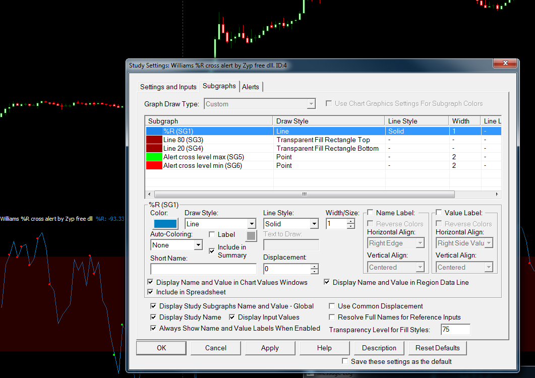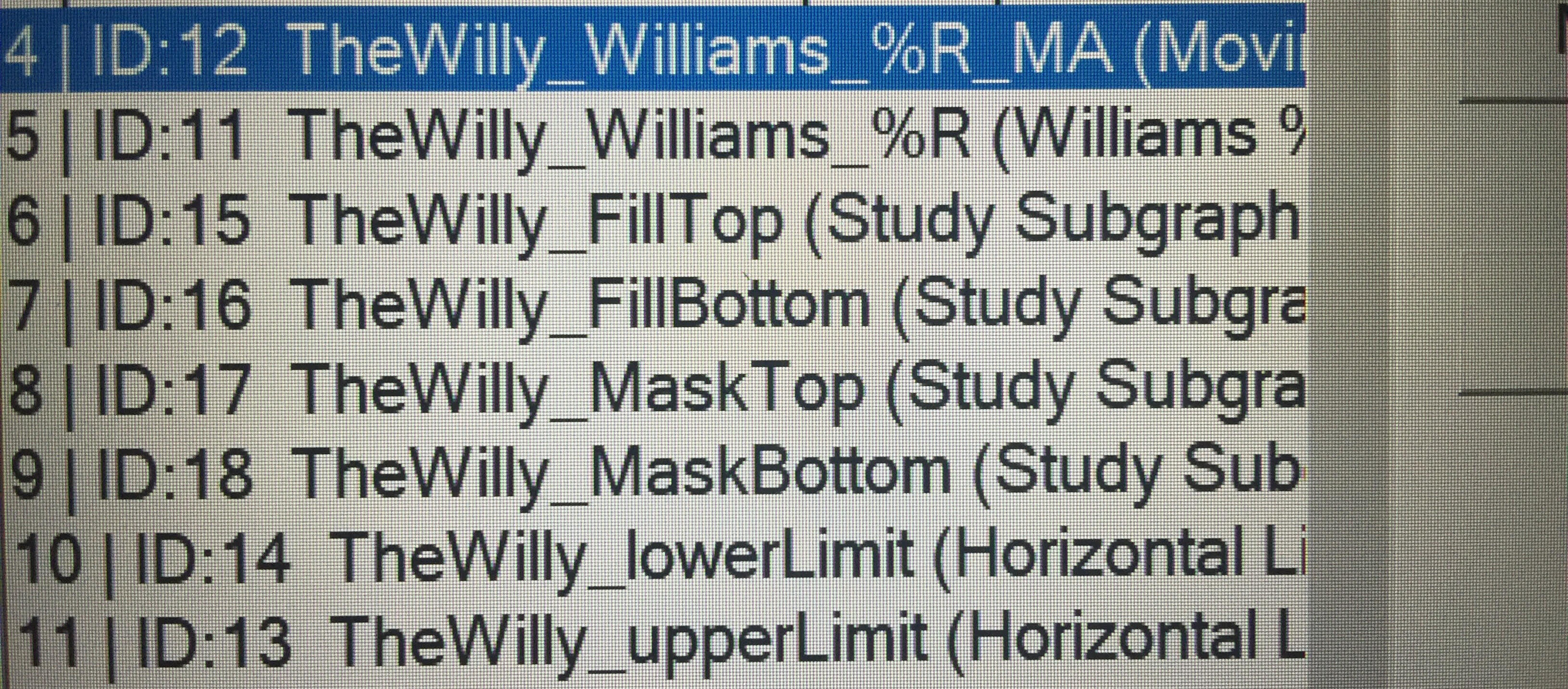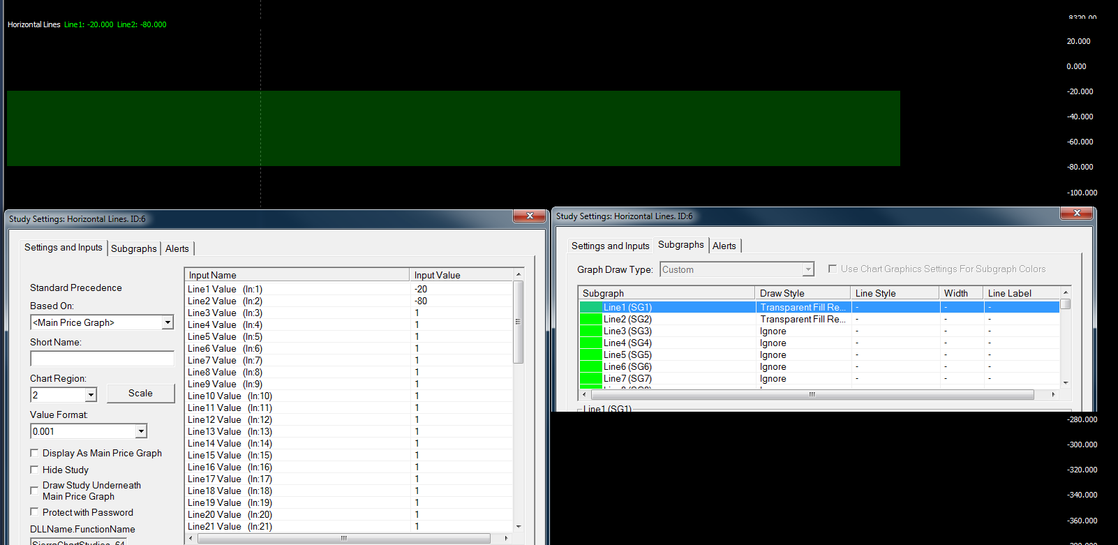 This is just my own study, it is in chart region 5 I have the following: 1) Willim %R 2) William %R (MA) 3) The blue line for the top limit (at -20) => A Horizontal Line Study (Line 1) <ID:13> 4) The red line for the bottom limit (at -80) => A Horizontal Line Study (Line 1) <ID:14> I'm just trying to shade the area between the two lines. No matter what I tried, it is not working. I cannot find the way to do `-20 < X < -80` so the area that is only between the two lines is shaded?! I got the inverse working. But not the area that I need. Date Time Of Last Edit: 2019-12-13 14:39:20