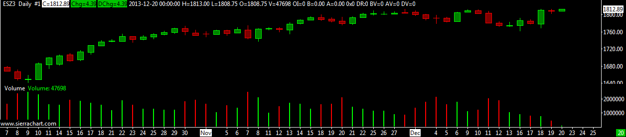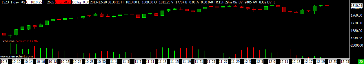 Hi, I opened a historic daily chart and an intraday daily chart for ESZ3 (Emini S&P 500) and the daily candles do not match up on both charts in several instances. Can you please let me know why this is happening? The first chart link is for the historic daily chart, the second chart link is for the intraday daily chart. http://www.sierrachart.com/image.php?l=1388277841589.png http://www.sierrachart.com/image.php?l=1388277873636.png |