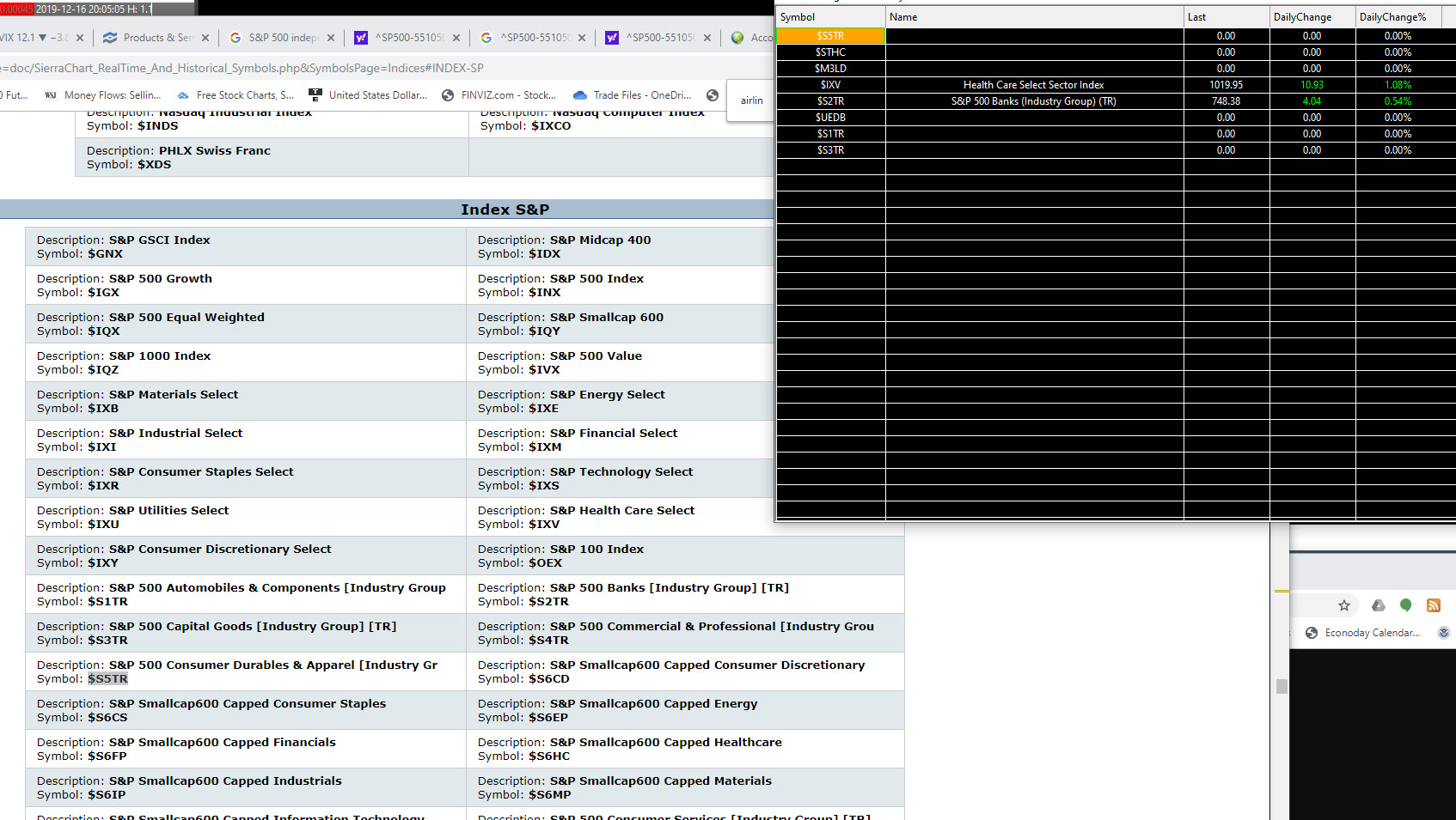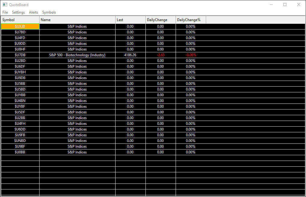 Hello, I am subscribed to the following equities data feeds: - U.S. Equities (NYSE, NASDAQ, AMEX, BATS) - S&P Indices - CBOE Indices I am trying to pull up serval symbols that are listed under (https://www.sierrachart.com/index.php?page=doc/SierraChart_RealTime_And_Historical_Symbols.php&SymbolsPage=Indices#INDEX-SP) and unable to. For example, when I use the symbol "$S3TR" (S&P 500 Capital Goods [Industry Group] [TR]) it just gives me zeros within the quote board. When I try a chart it says: "Symbol settings not found for current service". ESZ19_FUT_CME [C][M] #18 | StartDateTimeForLoadingOrderFills: 00:00:00 | 2019-12-16 19:56:46.193 SC Futures Order Routing/Data | Starting real-time market data updates for: $S1TR. ID: 53 | 2019-12-16 19:56:53.328 SC Futures Order Routing/Data | Subscribing to streaming market data in the service client is not supported. Symbol: $S1TR | 2019-12-16 19:56:53.328 SC Futures Order Routing/Data | Requesting security definition data for: $S1TR. ID: 53 | 2019-12-16 19:56:53.328 SC Data - All Services | Real-time data for symbol WIMHY is currently unavailable. | 2019-12-16 20:03:46.619 SC Data - All Services | Received security definition for symbol WIMHY | 2019-12-16 20:04:20.341 SC Data - All Services | Real-time data for symbol WIMHY has been restored. | 2019-12-16 20:04:20.341 SC Futures Order Routing/Data | Starting real-time market data updates for: $S3TR. ID: 54 | 2019-12-16 20:04:55.936 SC Futures Order Routing/Data | Subscribing to streaming market data in the service client is not supported. Symbol: $S3TR | 2019-12-16 20:04:55.936 SC Futures Order Routing/Data | Requesting security definition data for: $S3TR. ID: 54 | 2019-12-16 20:04:55.936 SC Futures Order Routing/Data | Starting real-time market data updates for: $S5TR. ID: 55 | 2019-12-16 20:05:25.065 SC Futures Order Routing/Data | Subscribing to streaming market data in the service client is not supported. Symbol: $S5TR | 2019-12-16 20:05:25.065 SC Futures Order Routing/Data | Requesting security definition data for: $S5TR. ID: 55 | 2019-12-16 20:05:25.065 SC Data - All Services | Real-time data for symbol WIMHY is currently unavailable. | 2019-12-16 20:14:42.309 SC Data - All Services | Received security definition for symbol WIMHY | 2019-12-16 20:15:16.079 SC Data - All Services | Real-time data for symbol WIMHY has been restored. | 2019-12-16 20:15:16.079 Thanks, Matthew Date Time Of Last Edit: 2019-12-17 04:14:47