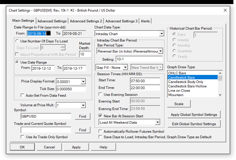 How do you change the Date Range to load from today's date starting backwards? see attached it is showing august it is Sierra data feed (free) Forex data in the screnshot "Use Number of Days to load' is not checked but when it is it still does not change to today 12/17 All my futures charts load from today going backwards to # of days to load fine |