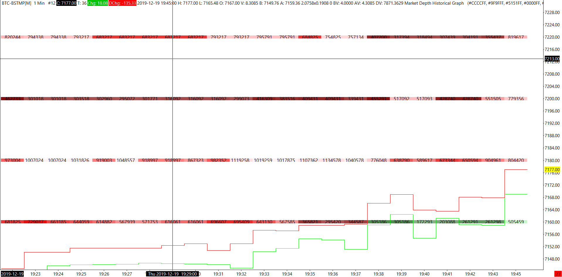 Hello, i don't know if i did something wrong or if there is a bug on the market deph historical graph for the bitstamp data on the pair BTCUSD,but, I get values only each 10 € level ( 7100 , 7110 , 7120 ... ) as you can see in the picture below. Can you help me please ? http://www.sierrachart.com/image.php?Image=1576787814780.png |