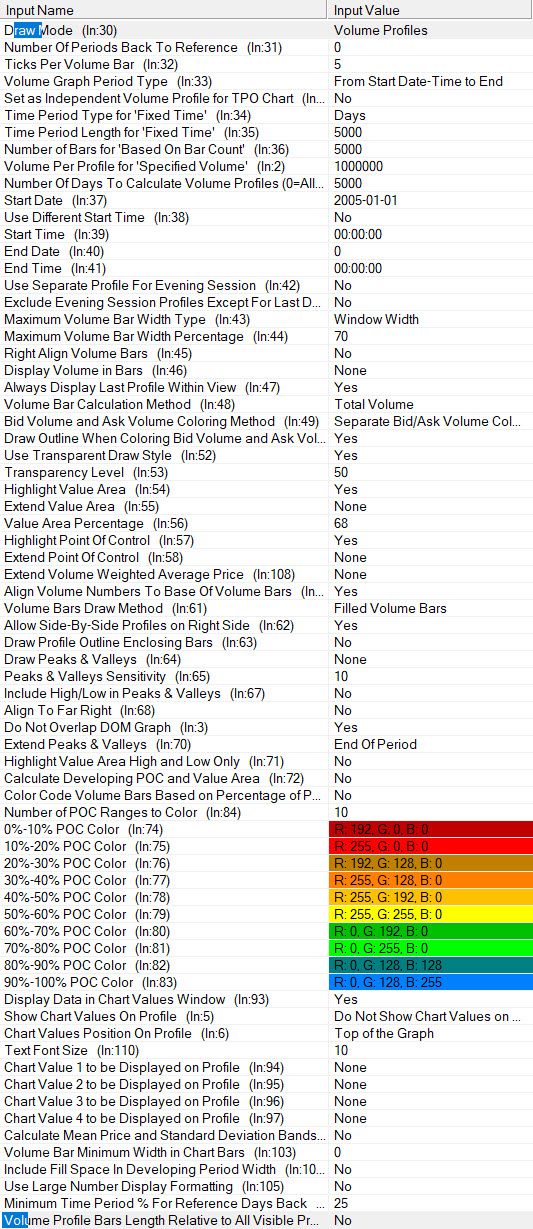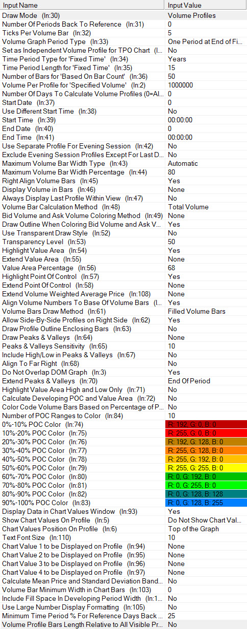 1. You can fix the profile to the Right Side. Refer to the following: Volume By Price Study: Right Aligning Volume Profiles with Space on Right Side of Chart 2. Refer to the following for why you are unable to change the Ticks per Volume Bar: Volume By Price Study: Ticks Per Volume Bar 3. Not sure what this question is about. You only need to load however much data you need. Refer to the following: https://www.sierrachart.com/index.php?page=doc/ChartSettings.html#DaysToLoad 4. If, by LVN, you are referring to a "Low Volume Node", these are called Valleys in Sierra Chart. Yes, you can display Peaks and Valleys based on the surrounding information. Refer to the following: Volume By Price Study: Draw Peaks and Valleys The POC is not controllable, it is automatically determined from the data. For the most reliable, advanced, and zero cost futures order routing, use the Teton service: Sierra Chart Teton Futures Order Routing |