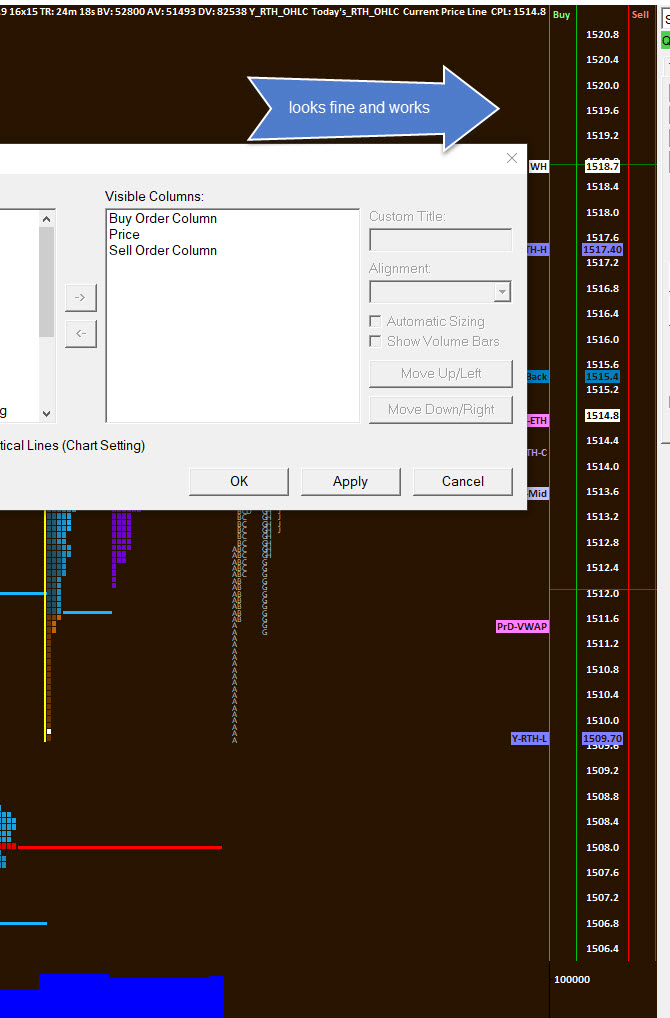 Hello, I am having an issue with the trading chart Dom. it is not displayed right in multiple charts (see image issue). On another chart, in the same chart book, it looks and works fine (see image) |