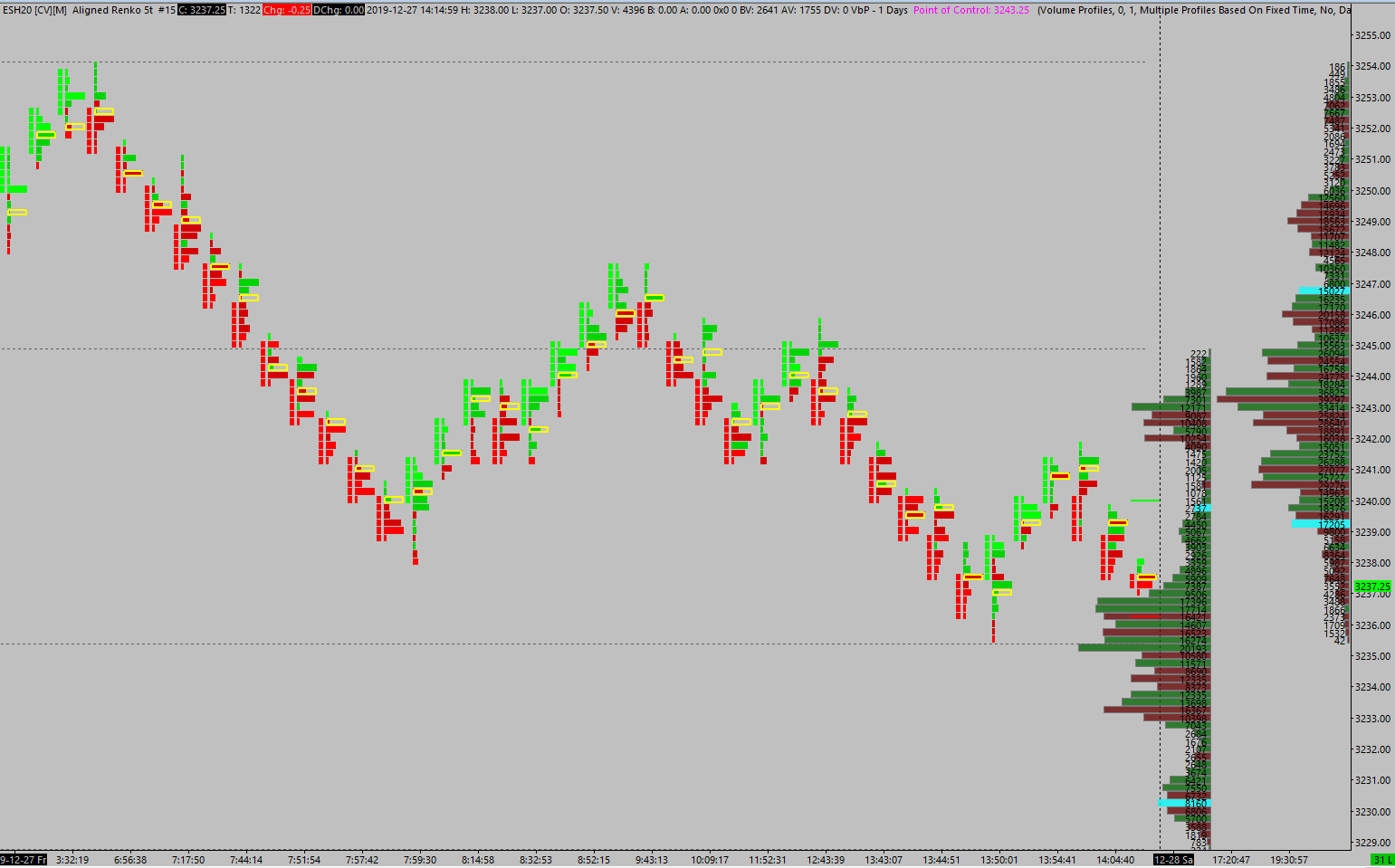 I have included a screenshot of a chart that has volume by price studies on it (indicated by the arrows). I want to export that volume by price data into a spreadsheet so that I can do some analysis on it. I would like it to be formatted so that one column on the spreadsheet is the price and another column is the total volume that was traded at that price. Is there a way to accomplish this? http://www.sierrachart.com/image.php?Image=1577566187974.png |