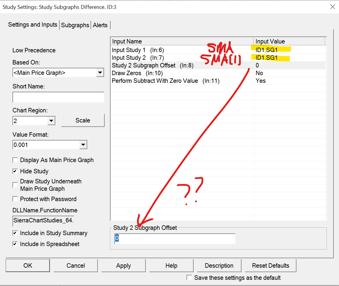 Thanks for the pointer. It looks easy but I've already run into a problem. I am using the Study Subgraphs Subtract Difference to subtract SMA - SMA[1]. But how can I insert the offset of SMA[1] (ie. SMA one bar ago)? There is the offset option but I only want to apply the offset to one of the SMA, not both. Please click the link to see the image. https://www.sierrachart.com/Download.php?Folder=SupportBoard&download=34257 |
