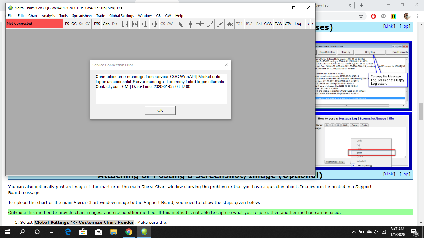 Software version: 2028 64-bit | 2020-01-05 08:46:21.288 Safe Mode enabled | 2020-01-05 08:46:21.288 Enabled for: Advanced Features 2. | 2020-01-05 08:46:21.288 Enabled for: Sierra Chart Historical Data Service. | 2020-01-05 08:46:21.288 Enabled for: Delayed Denali Real-Time Exchange Data Feed. | 2020-01-05 08:46:21.288 Allow Support for Sierra Chart Data Feeds is enabled. | 2020-01-05 08:46:21.288 Current selected Data/Trading service: CQG WebAPI | 2020-01-05 08:46:21.288 Custom symbol settings values: enabled | 2020-01-05 08:46:21.288 Chart Update Interval: 500 | 2020-01-05 08:46:21.288 Intraday Data Storage Time Unit: 1 | 2020-01-05 08:46:21.288 Time Zone: -05:00:00 (EST-05EDT+01,M3.2.0/02:00,M11.1.0/02:00) | 2020-01-05 08:46:21.288 2020-01-05 08:46:21 Local computer time | 2020-01-05 08:46:21.288 2020-01-05 13:46:21 Local computer time in UTC | 2020-01-05 08:46:21.288 2020-01-05 08:46:21 Local computer time in SC Time Zone | 2020-01-05 08:46:21.288 2020-01-05 13:39:07 Server time in UTC | 2020-01-05 08:46:21.288 Local computer UTC time and Server UTC time difference: 4 seconds. | 2020-01-05 08:46:21.288 Program path: C:\SierraChart2\ | 2020-01-05 08:46:21.288 Data Files path: C:\SierraChart2\Data\ | 2020-01-05 08:46:21.288 OS Version Number: 10.0 | 2020-01-05 08:46:21.288 Locale Setting: C | 2020-01-05 08:46:21.288 DLLs: UserContributedStudies_64.dll | 2020-01-05 08:46:21.288 CQG WebAPI | Connecting to server api.cqg.com | 2020-01-05 08:46:52.223 CQG WebSocket | Connecting to WebSocket server api.cqg.com:443 | 2020-01-05 08:46:52.223 CQG WebSocket socket (1) | Creating socket. Using TLS 1.2. | 2020-01-05 08:46:52.436 CQG WebSocket socket (1) | Connecting to IP: 208.48.16.35. | 2020-01-05 08:46:52.436 CQG WebSocket | Opening WebSocket. | 2020-01-05 08:46:52.498 CQG WebSocket | Sending WebSocket handshake. | 2020-01-05 08:46:52.498 CQG WebSocket | Server header | HTTP/1.1 101 Switching Protocols | 2020-01-05 08:46:52.745 CQG WebSocket | Server header | Connection: upgrade | 2020-01-05 08:46:52.745 CQG WebSocket | Server header | Sec-WebSocket-Accept: evqpuQ2NhIna5D4shw2QRmF8xSg= | 2020-01-05 08:46:52.745 CQG WebSocket | Server header | Server: WebSocket++/0.7.0 | 2020-01-05 08:46:52.745 CQG WebSocket | Server header | Upgrade: websocket | 2020-01-05 08:46:52.745 CQG WebSocket | Server header | | 2020-01-05 08:46:52.745 CQG WebSocket | Web socket state is now open. | 2020-01-05 08:46:52.745 CQG WebAPI | WebSocket connected. | 2020-01-05 08:46:52.745 CQG WebAPI | Sending market data logon message. | 2020-01-05 08:46:52.745 CQG WebAPI | Market data logon unsuccessful. Server message: Too many failed logon attempts. Contact your FCM. | 2020-01-05 08:46:52.893 CQG WebSocket socket (1) | CloseSocket call. | 2020-01-05 08:46:52.936 CQG WebAPI | Disconnected. | 2020-01-05 08:46:52.937 CQG WebSocket | WebSocket closed. | 2020-01-05 08:46:52.937 CQG WebAPI | WebSocket closed. | 2020-01-05 08:46:52.937 CQG WebSocket socket (1) | Write in progress. Shutdown being delayed. | 2020-01-05 08:46:52.937 CQG WebSocket socket (1) | Write has completed. Shutdown being performed. | 2020-01-05 08:46:52.990 CQG WebSocket socket (1) | Shutdown started. Waiting for graceful close. | 2020-01-05 08:46:52.990 CQG WebSocket socket (1) | Socket gracefully closed by remote side. | 2020-01-05 08:46:53.054 CQG WebSocket socket (1) | Closed. | 2020-01-05 08:46:53.054 CQG WebAPI | Connecting to server api.cqg.com | 2020-01-05 08:46:59.933 CQG WebSocket | Connecting to WebSocket server api.cqg.com:443 | 2020-01-05 08:46:59.933 CQG WebSocket socket (1) | Creating socket. Using TLS 1.2. | 2020-01-05 08:46:59.933 CQG WebSocket socket (1) | Connecting to IP: 208.48.16.35. | 2020-01-05 08:46:59.933 CQG WebSocket | Opening WebSocket. | 2020-01-05 08:46:59.994 CQG WebSocket | Sending WebSocket handshake. | 2020-01-05 08:46:59.994 CQG WebSocket | Server header | HTTP/1.1 101 Switching Protocols | 2020-01-05 08:47:00.227 CQG WebSocket | Server header | Connection: upgrade | 2020-01-05 08:47:00.227 CQG WebSocket | Server header | Sec-WebSocket-Accept: j3GVFCbNLq7VOj5pFIe+DsR/2ZE= | 2020-01-05 08:47:00.227 CQG WebSocket | Server header | Server: WebSocket++/0.7.0 | 2020-01-05 08:47:00.227 CQG WebSocket | Server header | Upgrade: websocket | 2020-01-05 08:47:00.227 CQG WebSocket | Server header | | 2020-01-05 08:47:00.227 CQG WebSocket | Web socket state is now open. | 2020-01-05 08:47:00.227 CQG WebAPI | WebSocket connected. | 2020-01-05 08:47:00.227 CQG WebAPI | Sending market data logon message. | 2020-01-05 08:47:00.227 CQG WebAPI | Market data logon unsuccessful. Server message: Too many failed logon attempts. Contact your FCM. | 2020-01-05 08:47:00.379 CQG WebSocket socket (1) | CloseSocket call. | 2020-01-05 08:47:00.428 CQG WebAPI | Disconnected. | 2020-01-05 08:47:00.428 CQG WebSocket | WebSocket closed. | 2020-01-05 08:47:00.428 CQG WebAPI | WebSocket closed. | 2020-01-05 08:47:00.428 CQG WebSocket socket (1) | Write in progress. Shutdown being delayed. | 2020-01-05 08:47:00.429 CQG WebSocket socket (1) | Write has completed. Shutdown being performed. | 2020-01-05 08:47:00.483 CQG WebSocket socket (1) | Shutdown started. Waiting for graceful close. | 2020-01-05 08:47:00.483 CQG WebSocket socket (1) | Socket gracefully closed by remote side. | 2020-01-05 08:47:00.543 CQG WebSocket socket (1) | Closed. | 2020-01-05 08:47:00.543 |