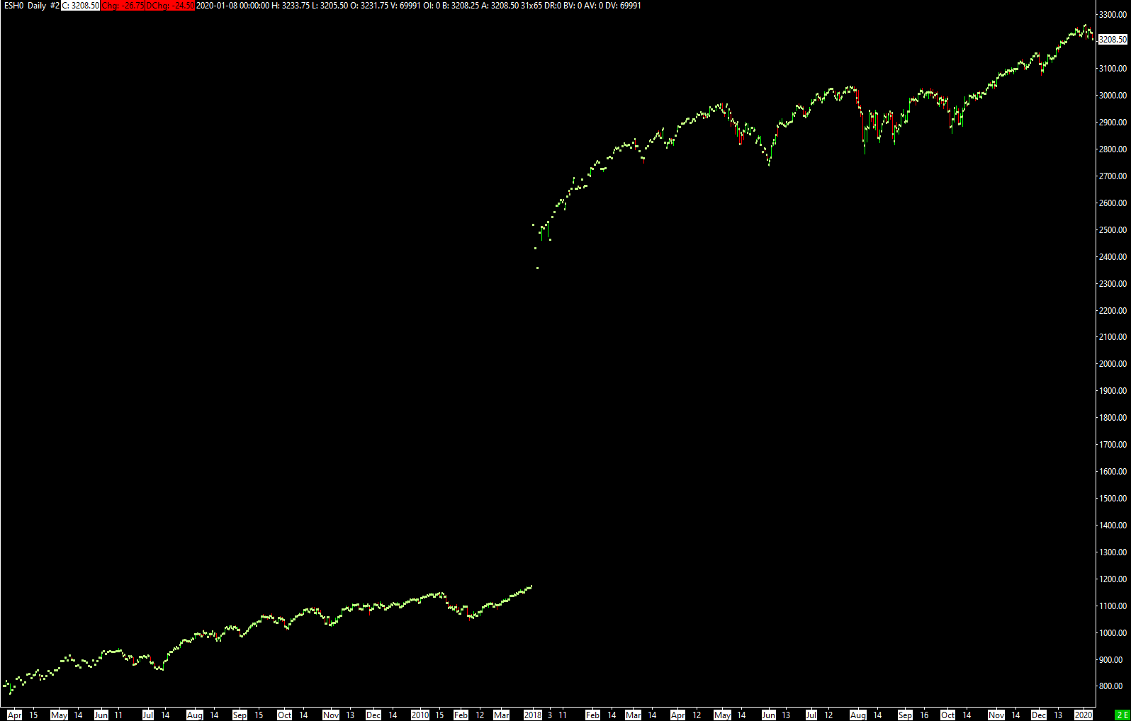 I am using version AT 2029 32bit, and just recently been having issues with the ES historical chart. When I go to find symbol, and open the historical chart for ESH0, I look at the chart setting date range, which gives me a date from 12/19/2008 to current date. My chart shows me missing data from 3/19/2010 to 12/20/2018, which looks like a huge price gap on the chart. I never had this issue before, is there a problem with this version I'm using, it seem to happen when I upgraded, what would be the fix, also I would like to keep this or any 32bit version. Thanks!