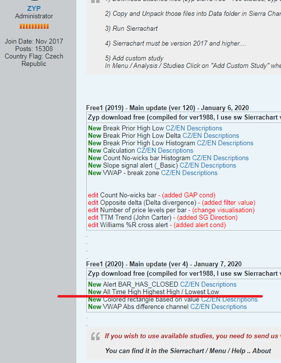 Andreas sorry, via SC is not up-to-date (Everyone has a different version of sierrachart, it is not possible to ensure the functioning of everyone, so I prefer to update the forum, everyone chooses according to their version).There are over 200 studies on the forum, download update file there ... Thanks to the great work of the Sierra team (request for the Summary window) will be created a very large number of new studies from multiple timeframes and more ;) .... will be created very soon ...... Login to the forum for the latest update ... Date Time Of Last Edit: 2020-01-09 19:46:22