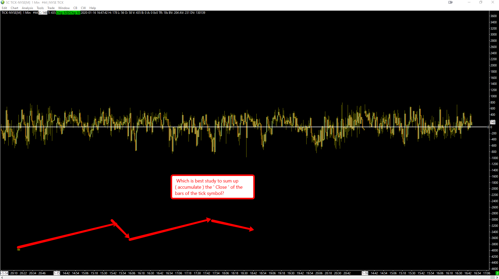 Hi, Pls help - which study can i use to add the 'close' of the symbol 1 minute candles ? In my case it is the NYSE TICK, which oscilates between + / - 800 ish. I am looking for a cumulative line . Many thanks, |