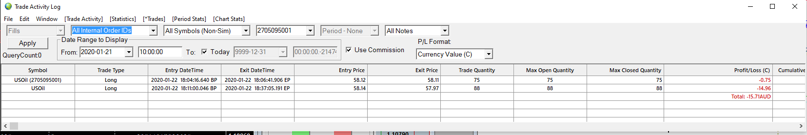 HI,I HAVE TROUBLE GETTING THE ORDER QUANTITY SETTINGS RIGHT FROM SIERRA CHARTS I OPENED 2 LIVE TEST POSITIONS WITH A $15 STOP LOSS WITH A NET LOSS OF -15.71AUD, HOWEVER THE ACTUAL LOSS REFLECTING IN FXCM TRADE STATION IS -229.81AUD.I HAVE ATTACHED TWO IMAGES SHOWING THIS ,YOU CAN SEE THE LOSS IN THE TRADE ACTIVITY LOG AS -15.71AUD(AS INTENDED) AND ALSO IN THE FXCM TRADE AS -229.81 AUD. IAM AWARE OF ORDER QUANTITY FROM FXCM AND I WAS USING THE CHART TRADING DOM WITH BRACKET ORDERS ALREADY SET. SO I JUST INPUT NUMBER OF TICKS FOR STOP LOSS AND THEN I ADJUST ORDER QUANTITY ACCORDING DOLLAR VALUE BEING GENERATED BESIDES THE STOP PARAMETERS DOING THIS RESULTS IN BIGGER ACTUAL POSITION BECAUSE THE ORDER QUANTITY SUGGESTED BY THE DOLLAR VALUE FROM STOP LOSS IS WAY OUT.HOW CAN I SOLVE THIS ERROR? PLEASE FIND BOTH IMAGES ATTACHED |