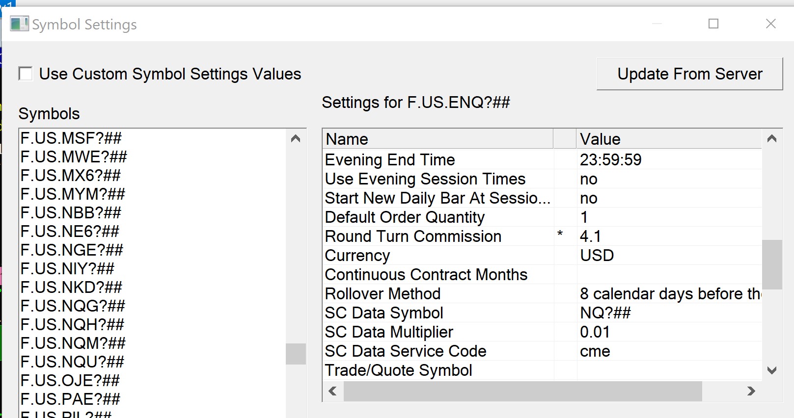 Refer to the documentation here for this: Trade Activity Log: Use Commission You did not enable the option on the Global Symbol Settings window to use custom symbol settings values. Sierra Chart Support - Engineering Level Your definitive source for support. Other responses are from users. Try to keep your questions brief and to the point. Be aware of support policy: https://www.sierrachart.com/index.php?l=PostingInformation.php#GeneralInformation For the most reliable, advanced, and zero cost futures order routing, *change* to the Teton service: Sierra Chart Teton Futures Order Routing |
