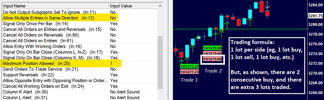 In the spreadsheet formula I've selected NO for "Multiple entries in the same direction" and specified 1 as the order size. Hence, I should not see two or more long (or short) traedes in the same direction and no more than 1 lot per trade. However, I've been getting wrong output lately while running the Replay. Please see the attachment for clarification.