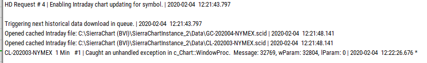 We want you to first refer to help topic 17 in regards to this: Sierra Chart Unexpectedly Shutting Down | Memory Errors | Unusual Software Problems | Exception Errors | Freezing of User Interface Sierra Chart Support - Engineering Level Your definitive source for support. Other responses are from users. Try to keep your questions brief and to the point. Be aware of support policy: https://www.sierrachart.com/index.php?l=PostingInformation.php#GeneralInformation For the most reliable, advanced, and zero cost futures order routing, *change* to the Teton service: Sierra Chart Teton Futures Order Routing |