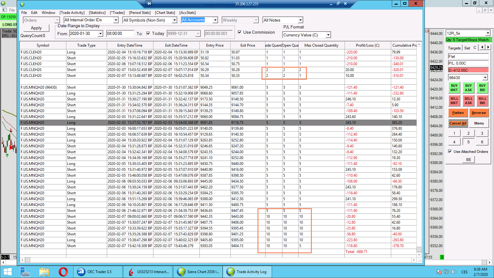 Today I have traded my common setup 5 MNQ and 1 CL contract For some reason trade activity log shows 10 contracts and 2 contract respectively but 'closed quantity' shows correct size 5 MNQ & 1 CL You can see the screenshot attached There was a short connection drop at about 8.45 US CT so this might be the reason? |